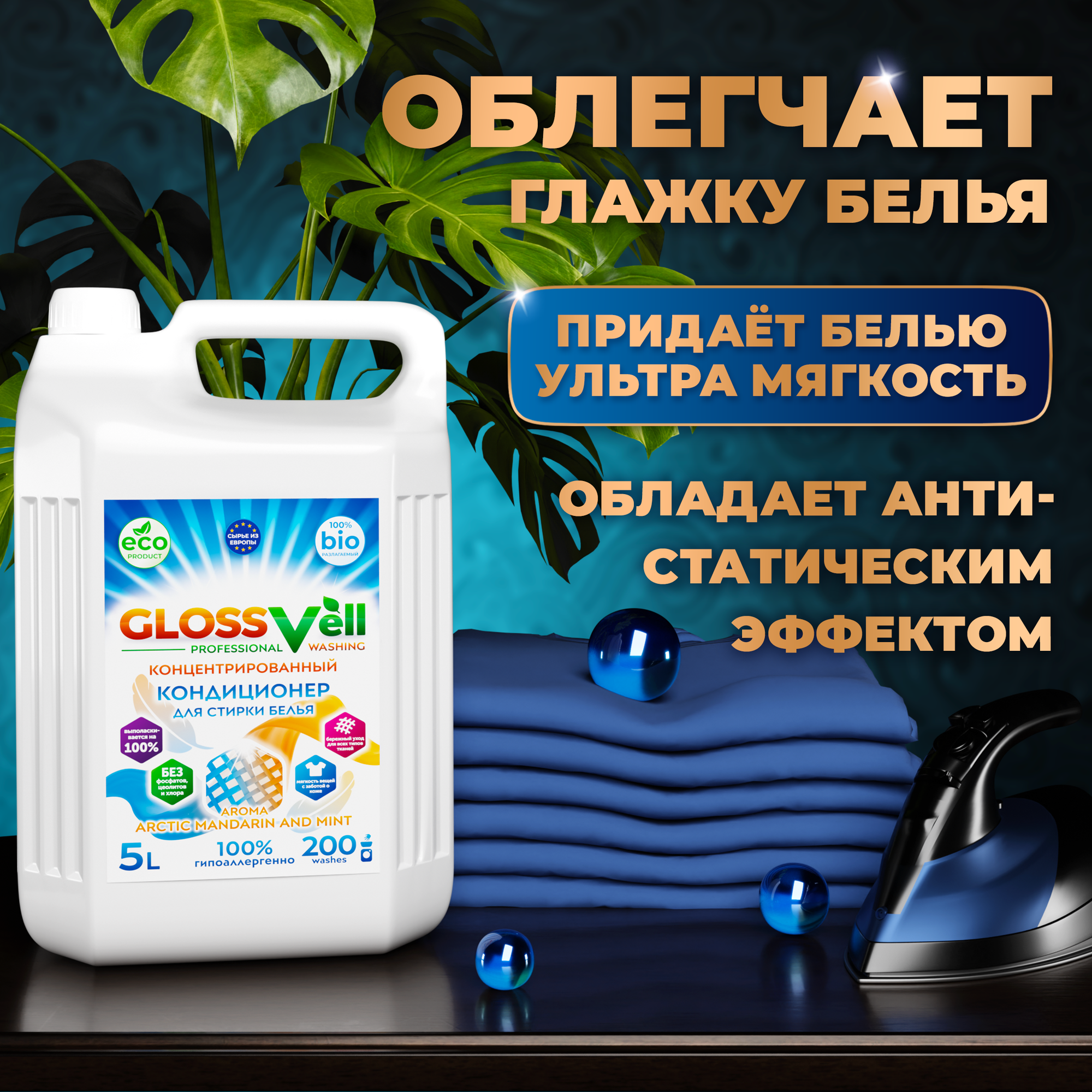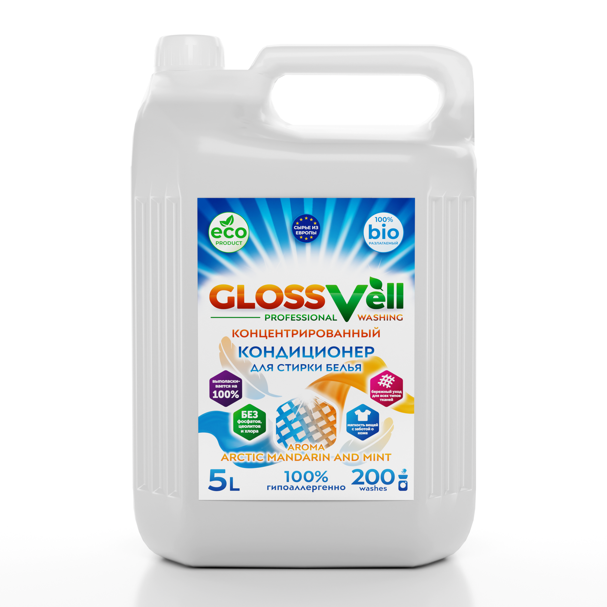Купить Кондиционер ополаскиватель для стирки белья Glossvell с ароматом Artic Mandarin and Mint 5 литров , концентрат, гипоаллергенный, ЭКО средство 200 стирок