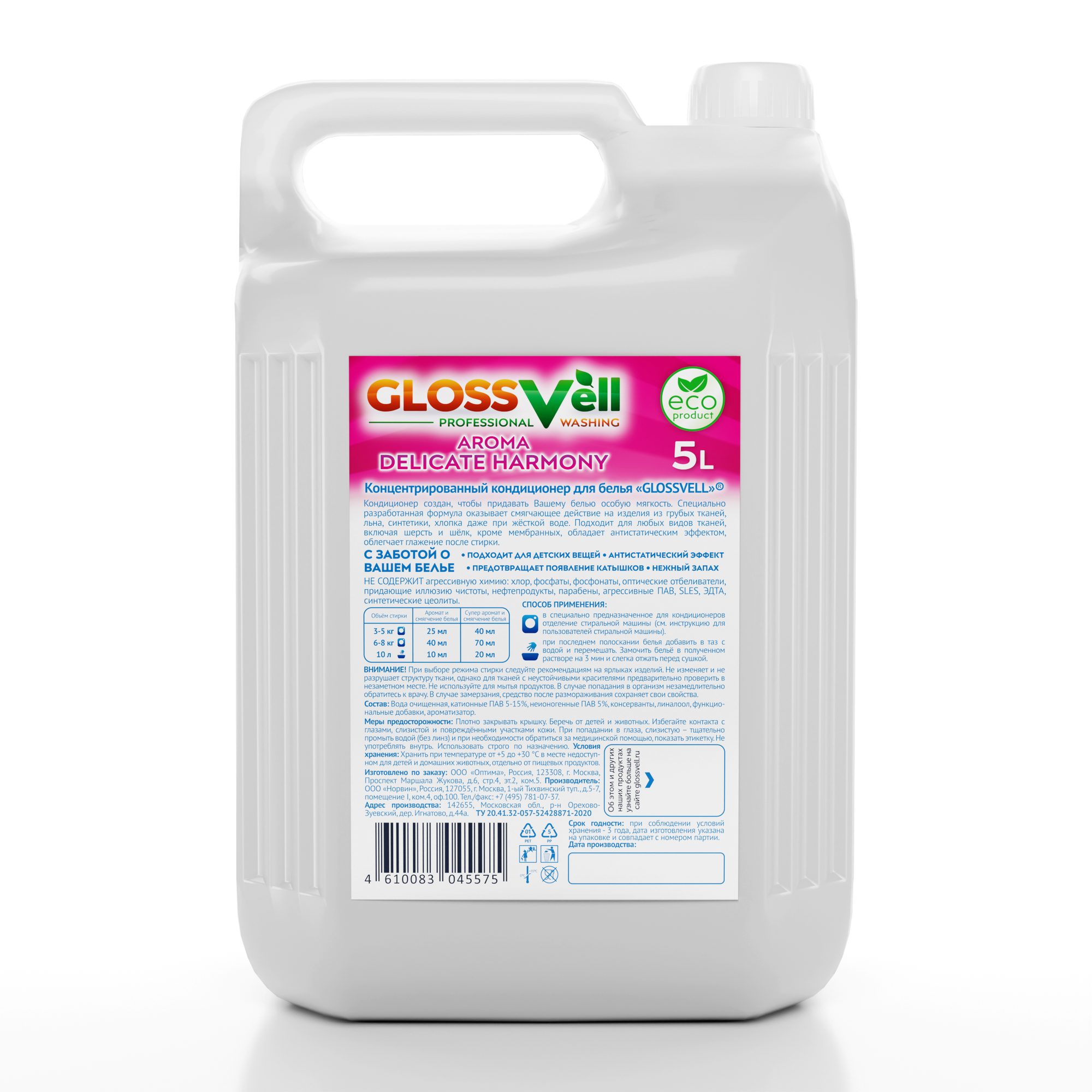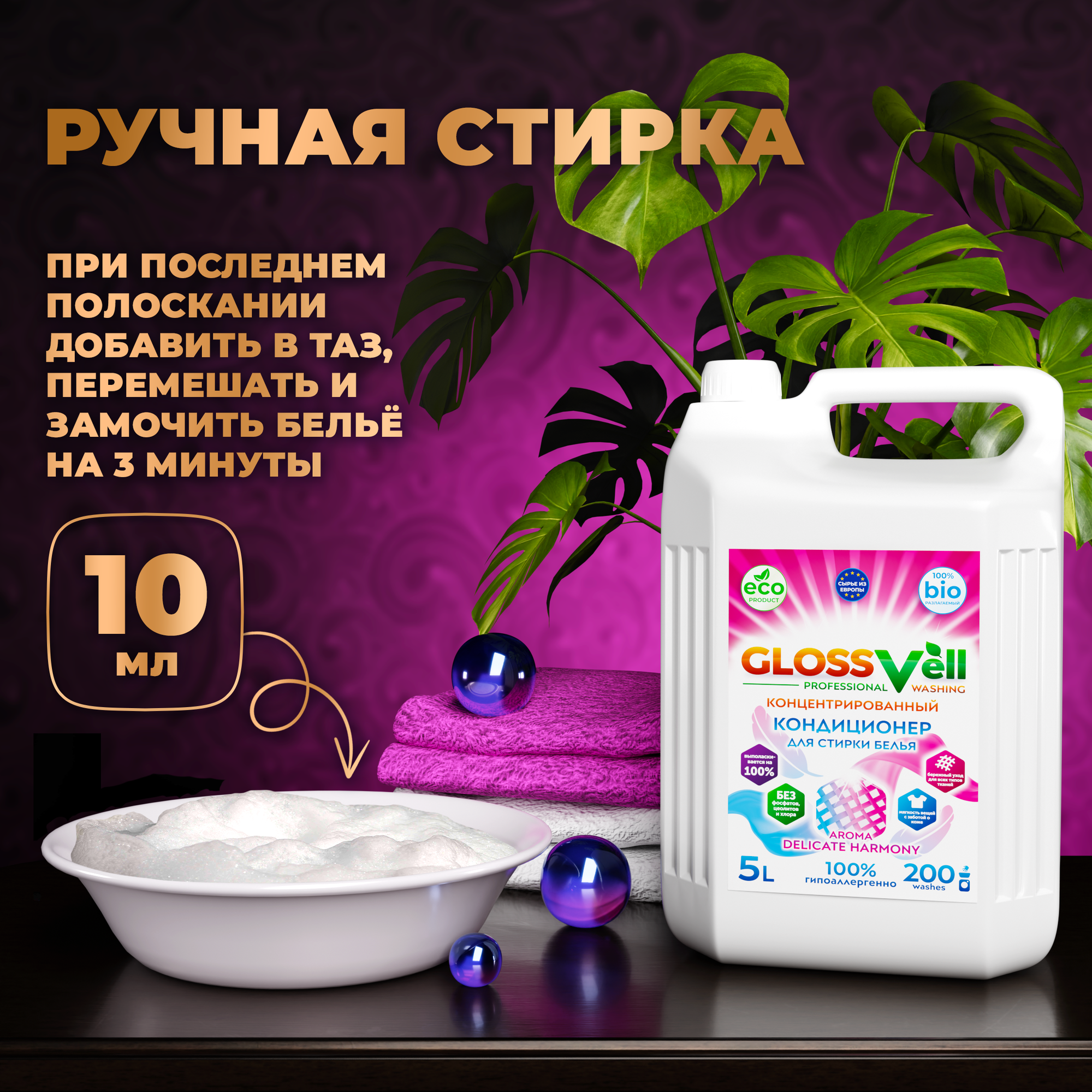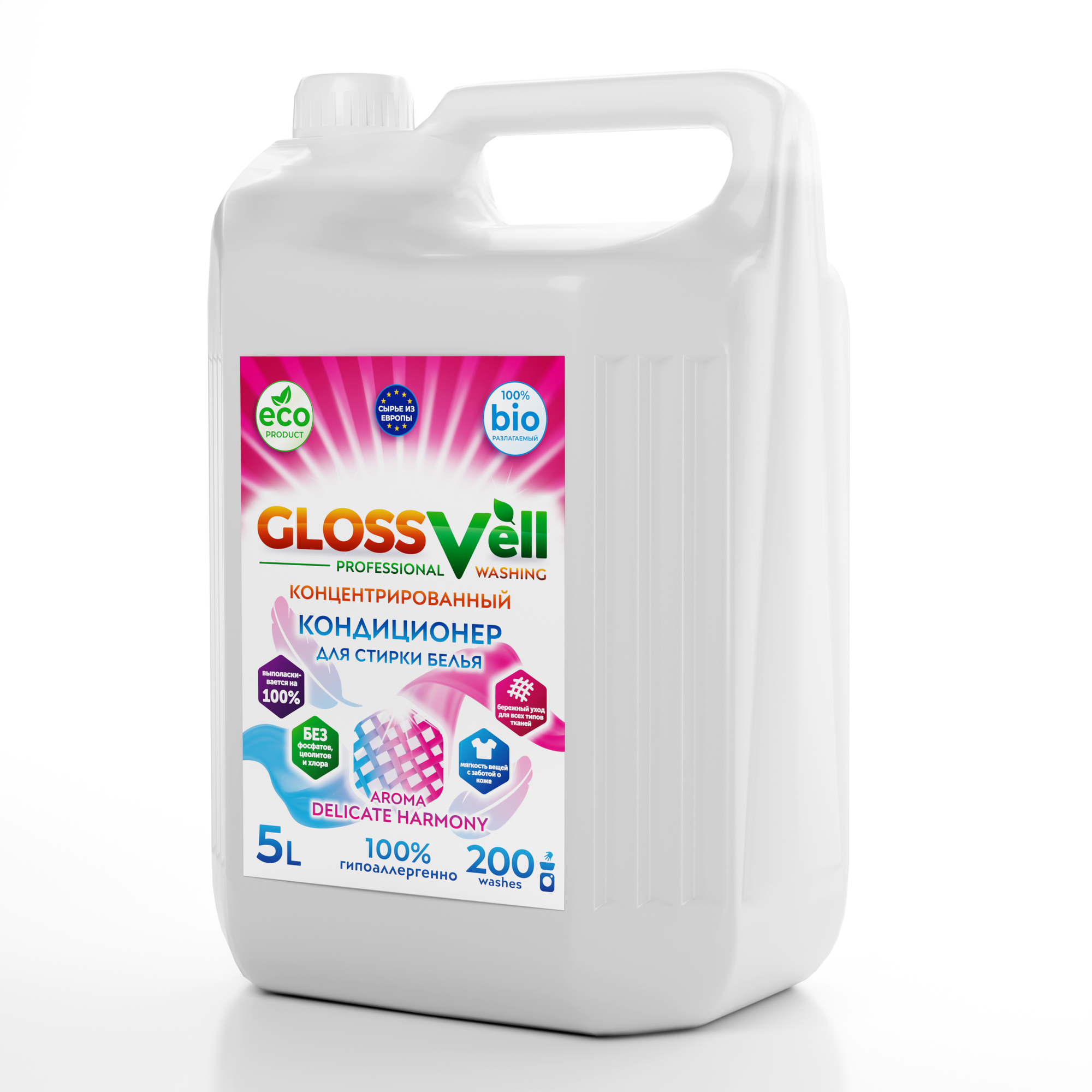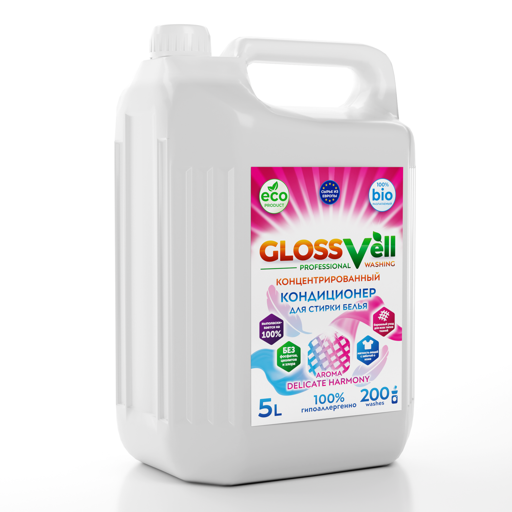 Купить Кондиционер ополаскиватель для стирки белья Glossvell Delicate Harmony 5 литров , концентрат, гипоаллергенный, ЭКО средство 200 стирок