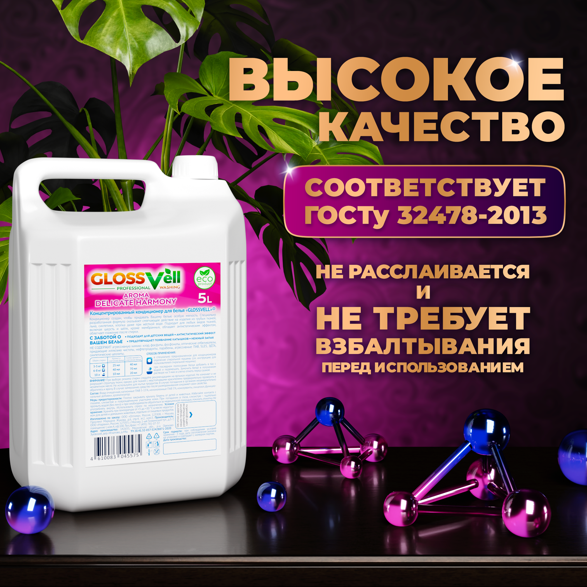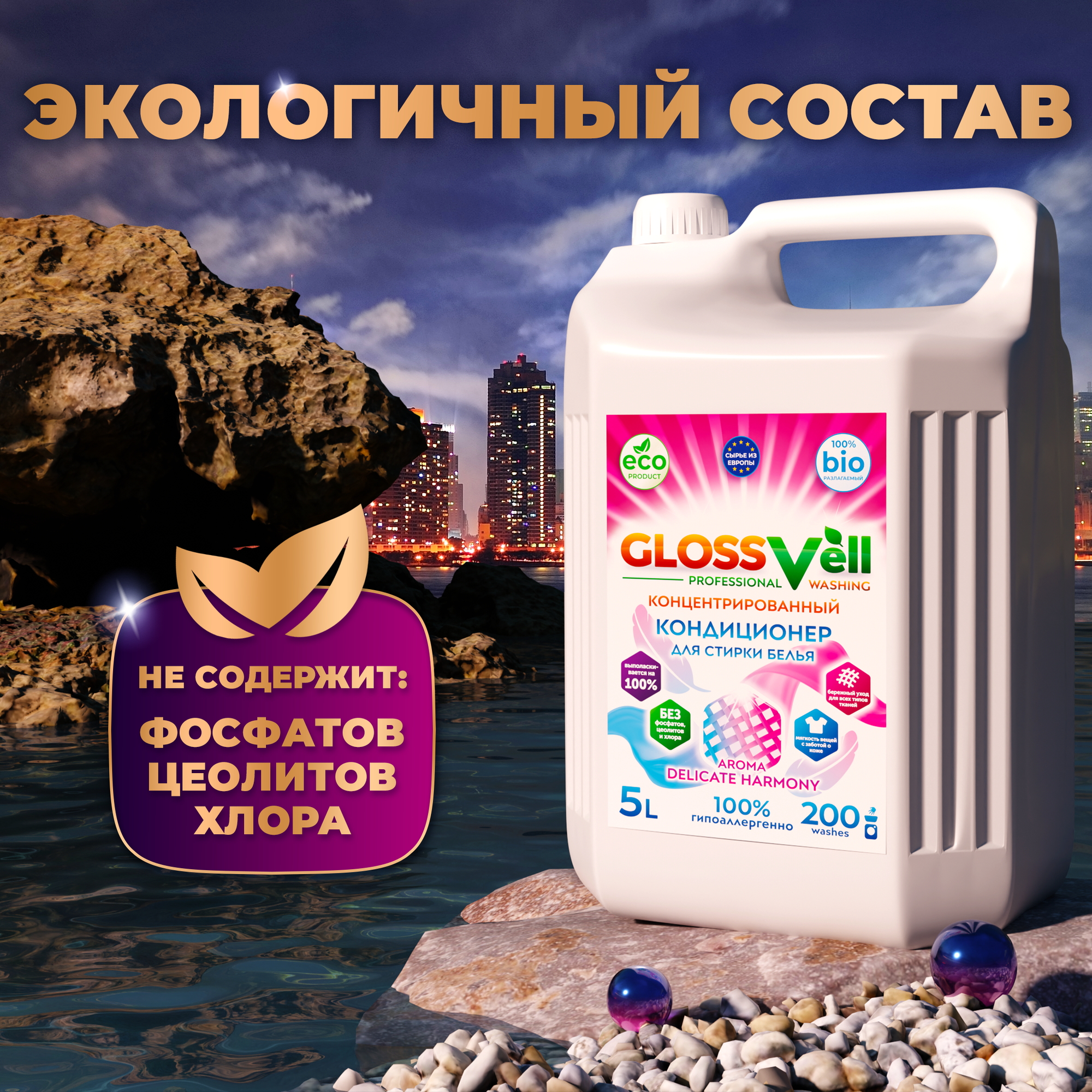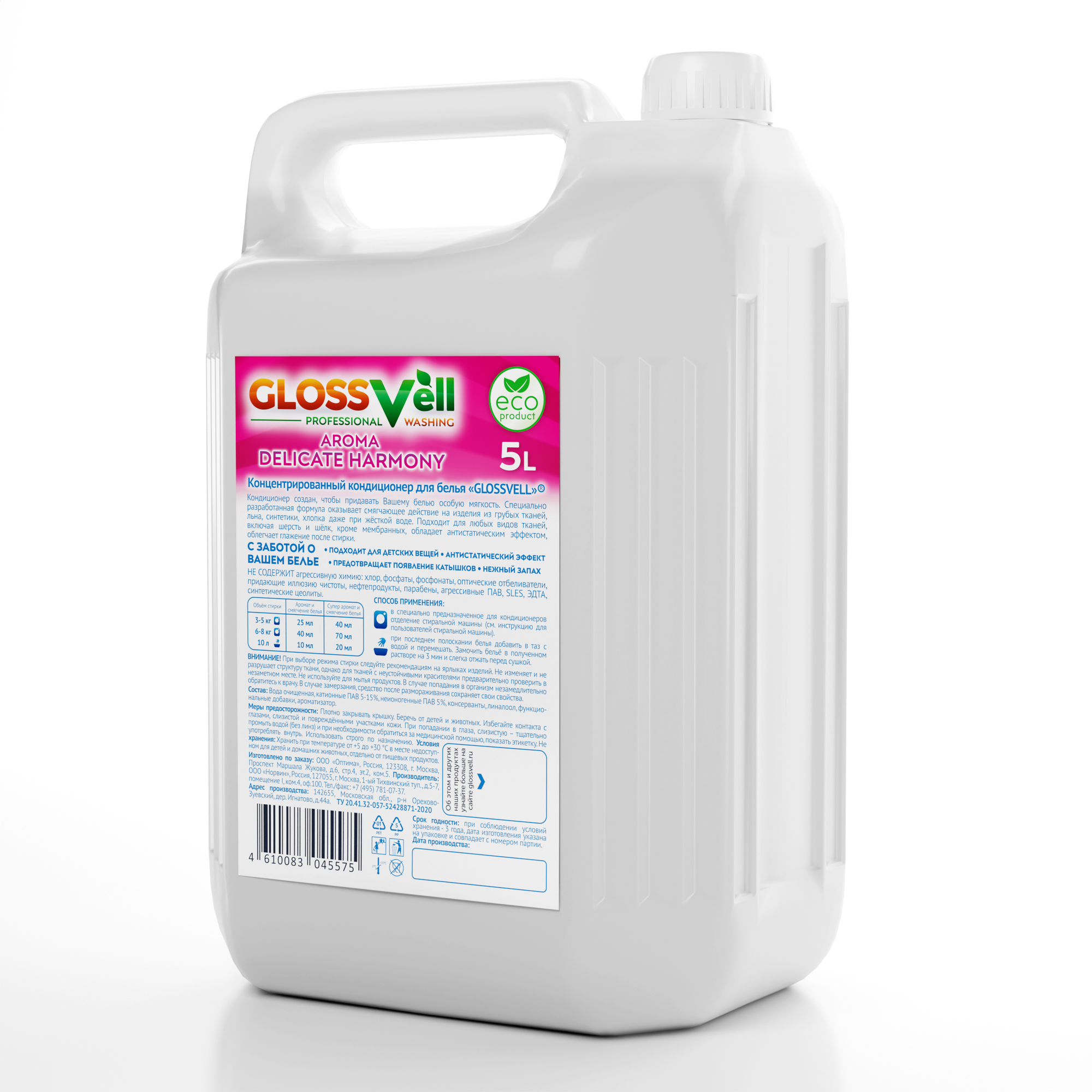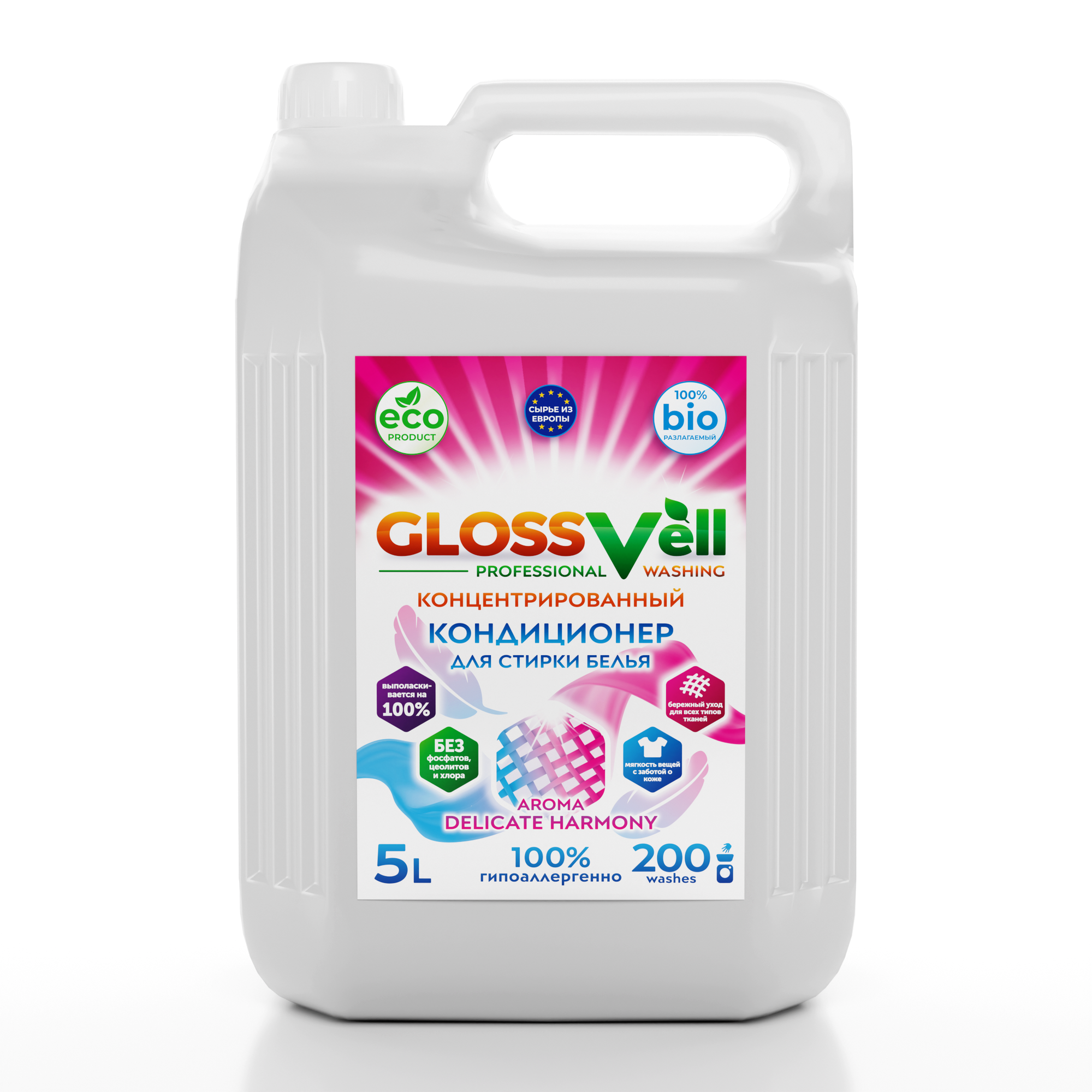 Купить Кондиционер ополаскиватель для стирки белья Glossvell Delicate Harmony 5 литров , концентрат, гипоаллергенный, ЭКО средство 200 стирок