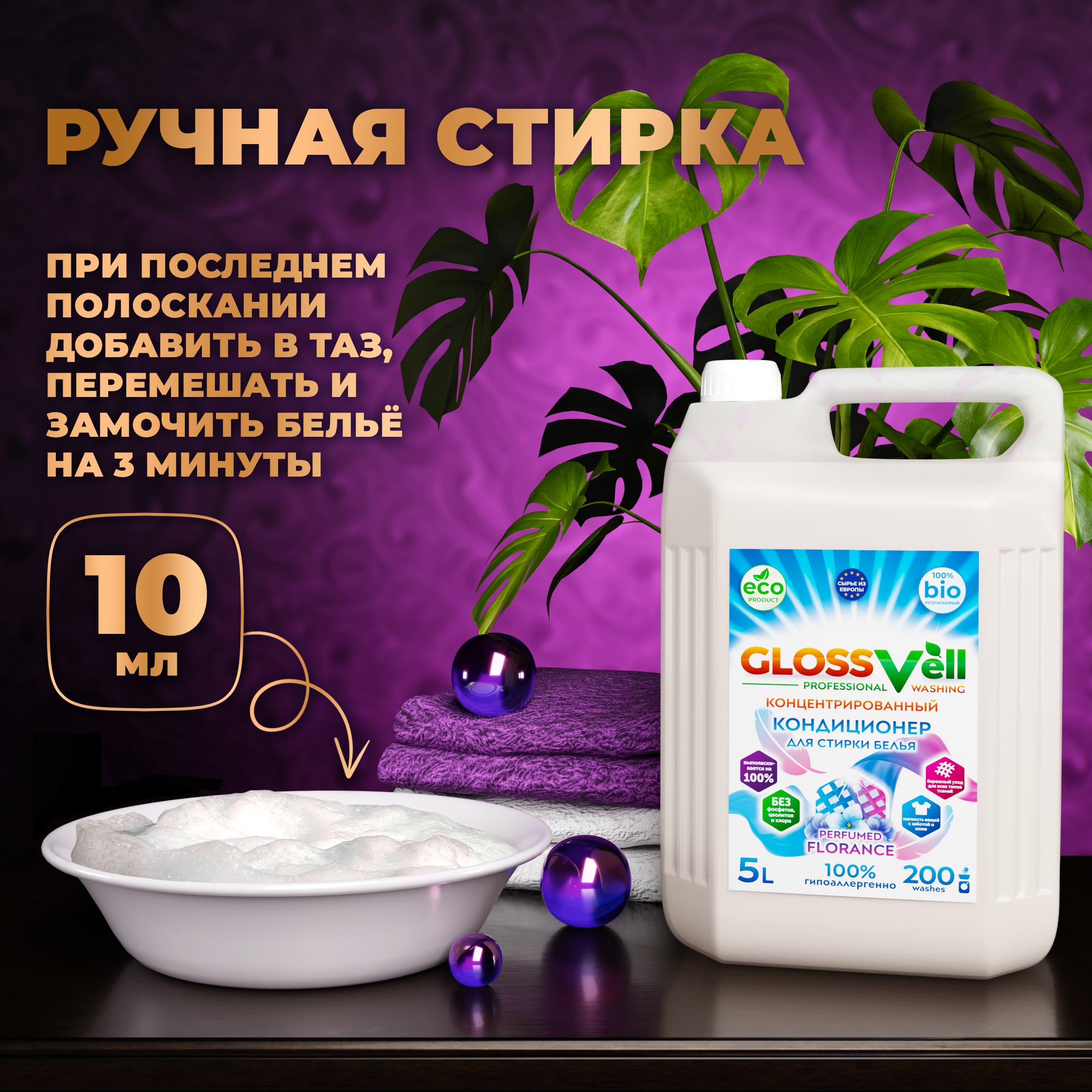 Кондиционер ополаскиватель для стирки белья Glossvell 5 л , концентрированный, гипоаллергенный, ЭКО средство (200 стирок)