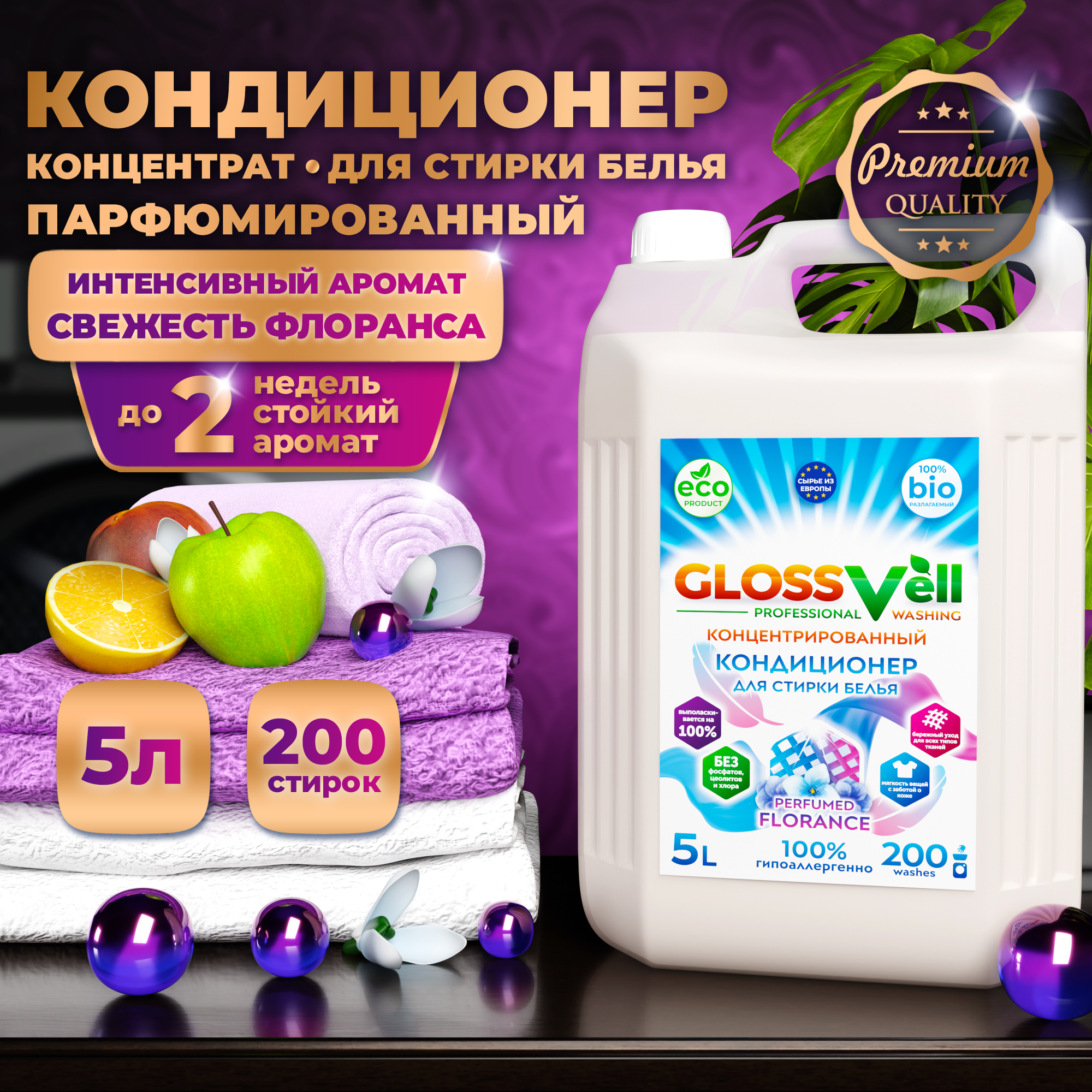 СохранитьКондиционер ополаскиватель для стирки белья Glossvell Florance 5 л, концентрированный, гипоаллергенный, ЭКО средство (200 стирок) интересное: