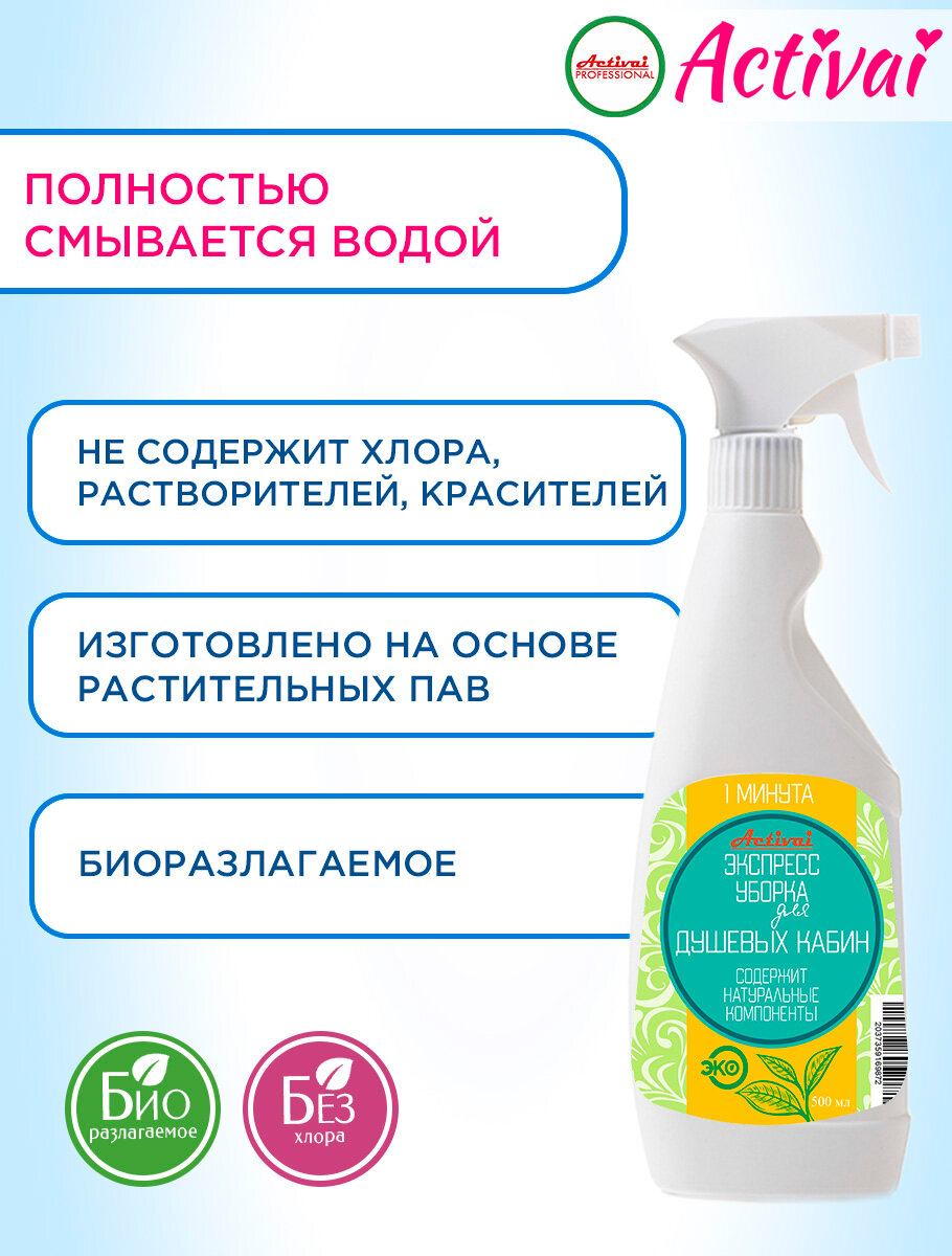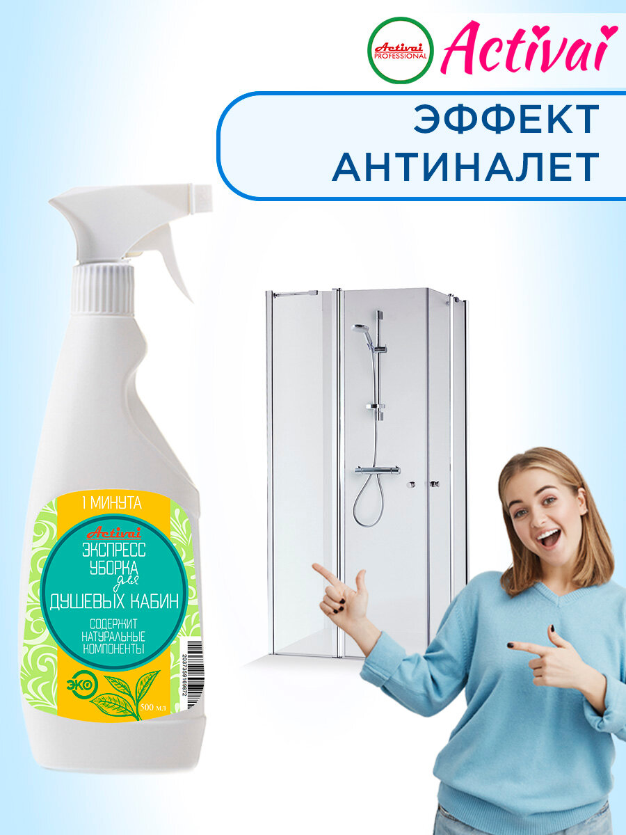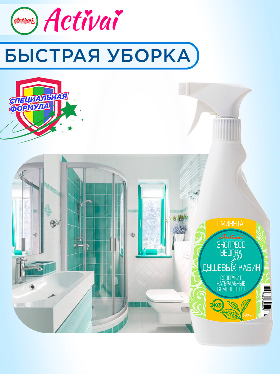 Средство для душевых кабин, чистящее средство для ванны, средство от известкового налета, удалитель ржавчины, очиститель пластика, антиналет, бытовая химия, концентрат, спрей 500 мл. Быстрая уборка Activai PROFESSIONAL