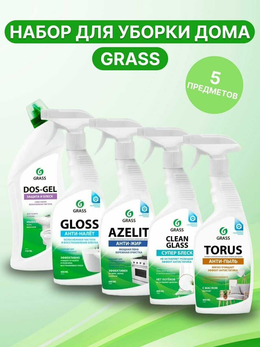 Набор GRASS для уборки дома: для кухни Азелит антижир Azelit, для ванны Gloss, чистящее средство для стекол и зеркал Clean glass, для туалета и ванной Dos Gel, полироль для мебели Torus интересное: