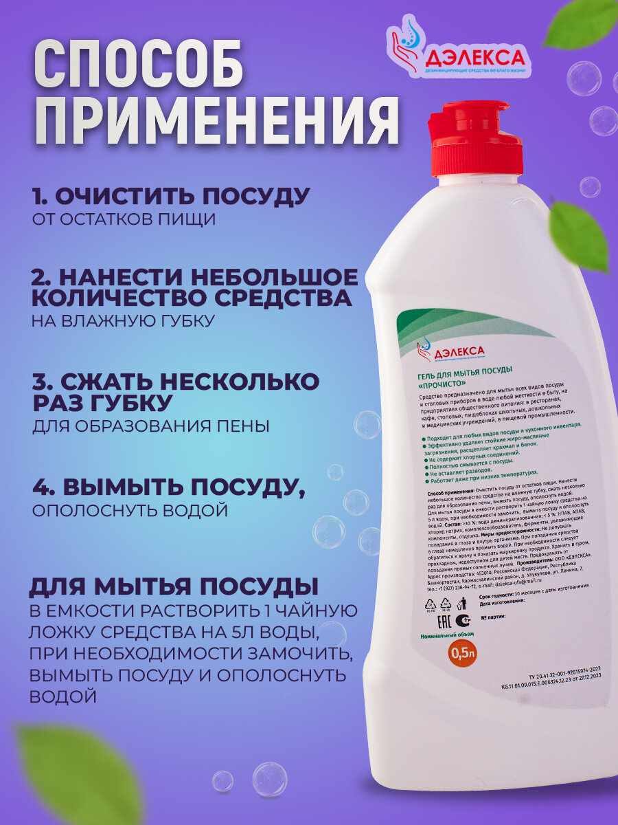| Способ применения | Очистить посуду от остатков пищи. Нанести небольшое количество средства на влажную губку, сжать несколько раз для образования пены, вымыть посуду, ополоснуть водой. Для мытья посуды в емкости растворить 1 чайную ложку средства на 5л воды, при необходимости замочить, вымыть посуду и ополоснуть водой |