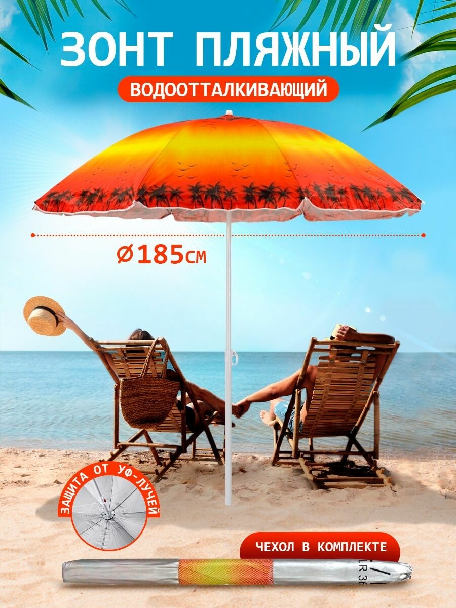 Зонт пляжный большой складной, садовый от солнца для отдыха 1,75 м в чехле, (оранжевый/принт "Закат в джунглях") 35LR
