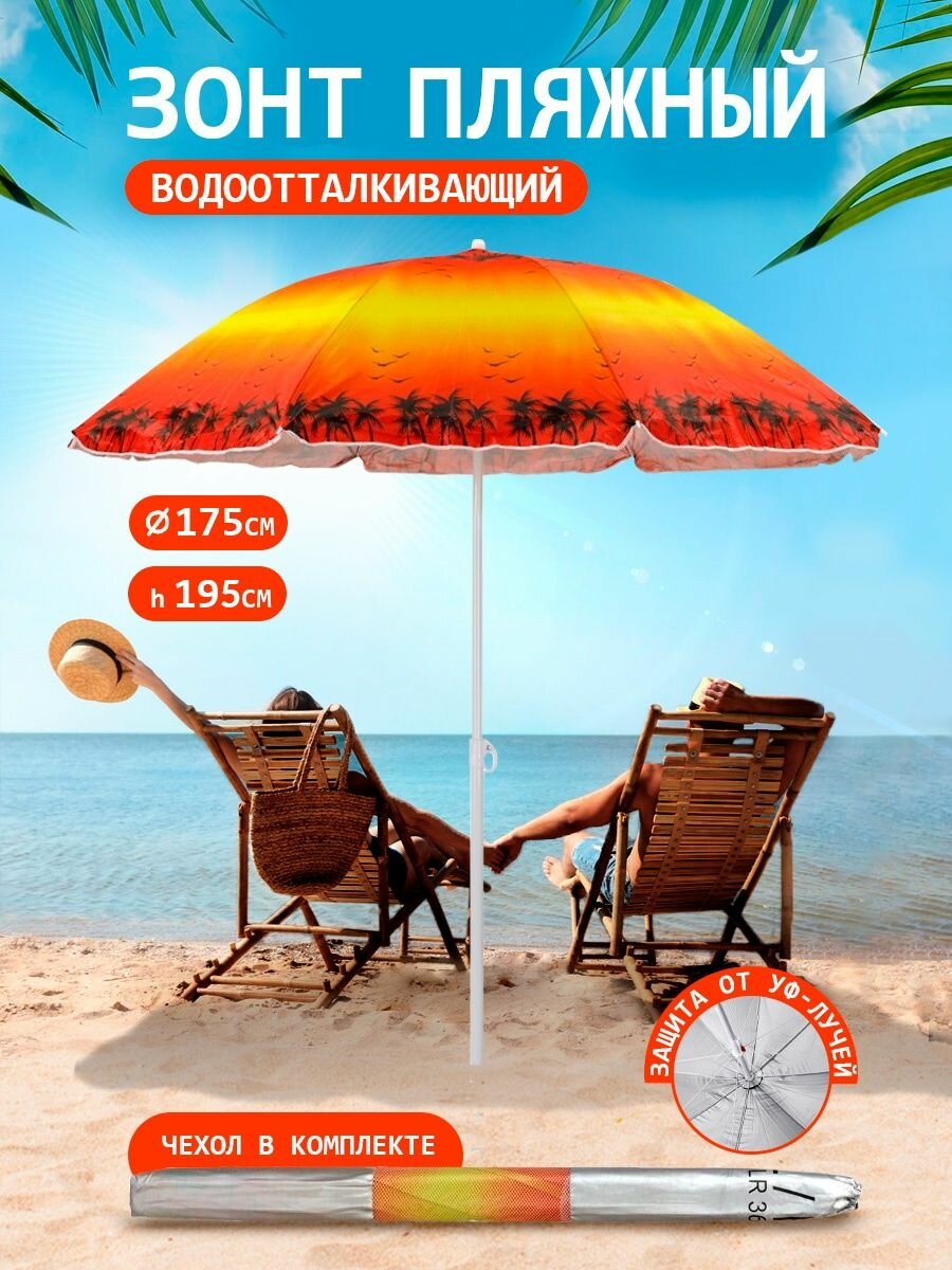 Зонт пляжный большой складной, садовый от солнца для отдыха 1,75 м в чехле, (оранжевый/принт "Закат в джунглях") 35LR