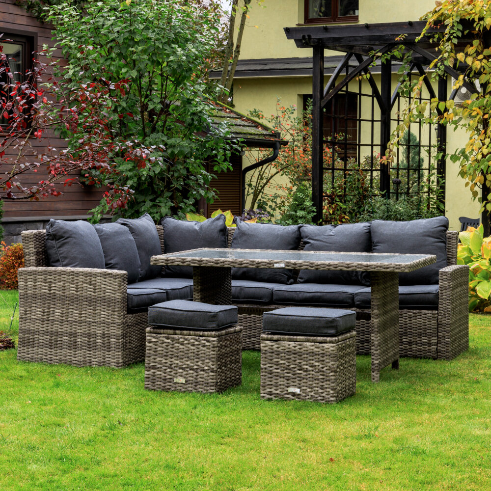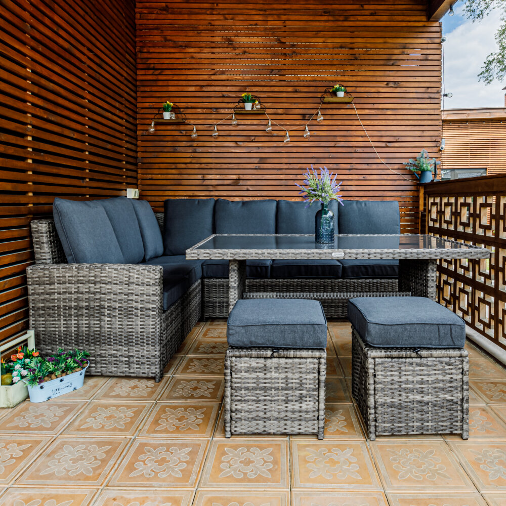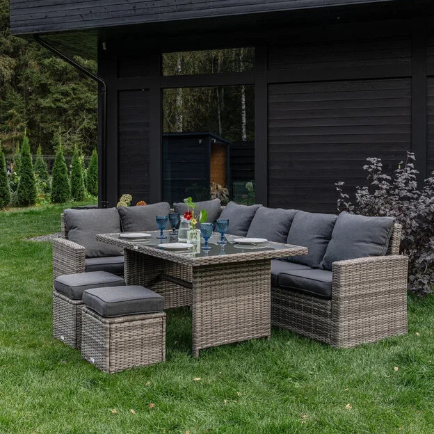 | Комплектация | угловой диван, состоящий из двух частей, обеденный стол, 2 пуфа |