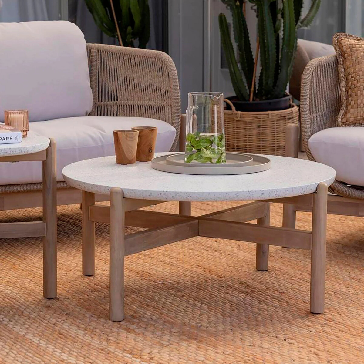 | Габариты | Кресло с подушками, размер 86х80х66 cм. Диван двухместный с подушками, размер 178х80х66 cм. Столик кофейный: подстолье 84х84х40 cм + столешница Terrazzo Ø80х2.5 cм. |