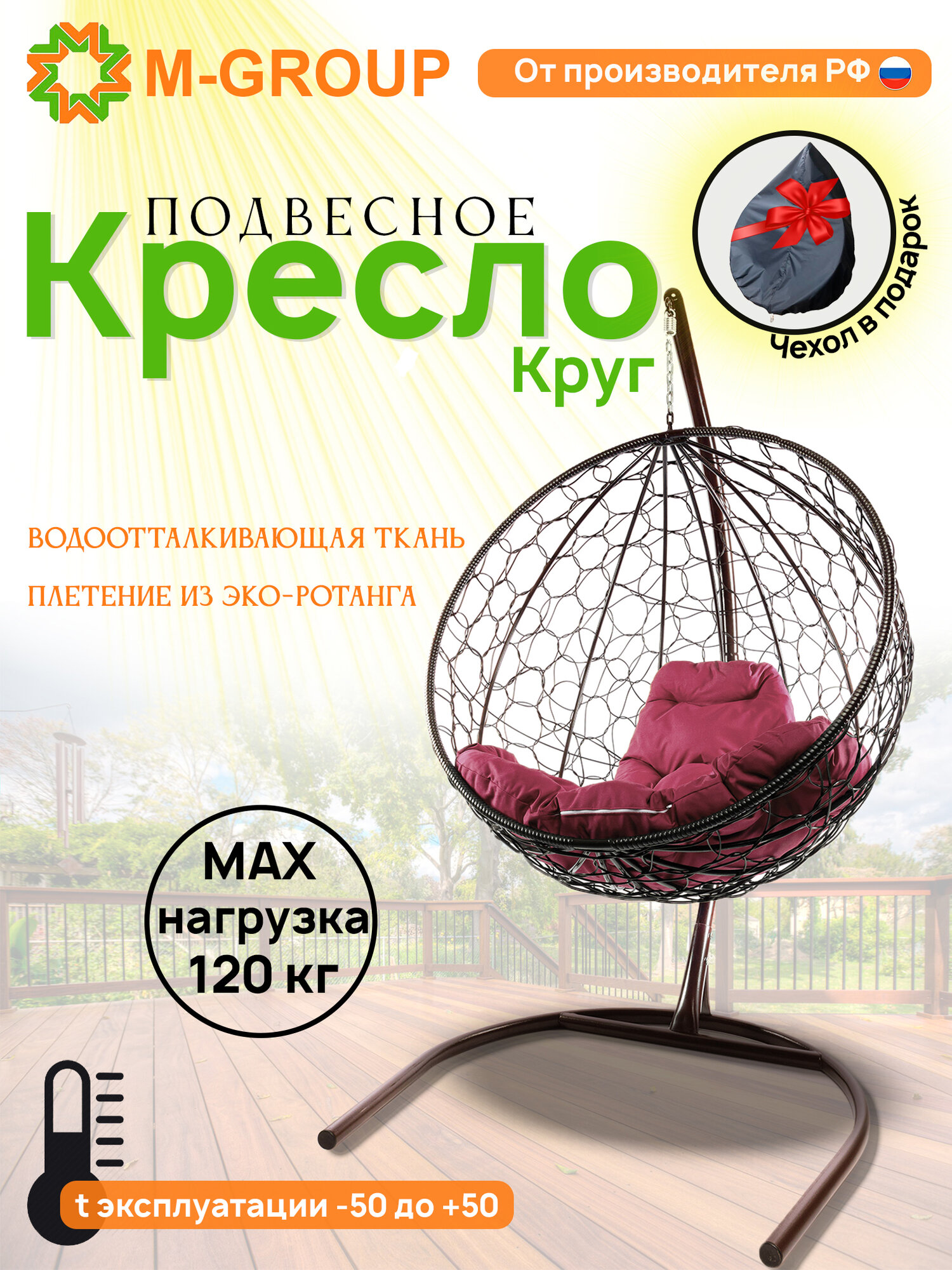 Купить Подвесное кресло Круг ротанг коричневое, бордовая подушка
