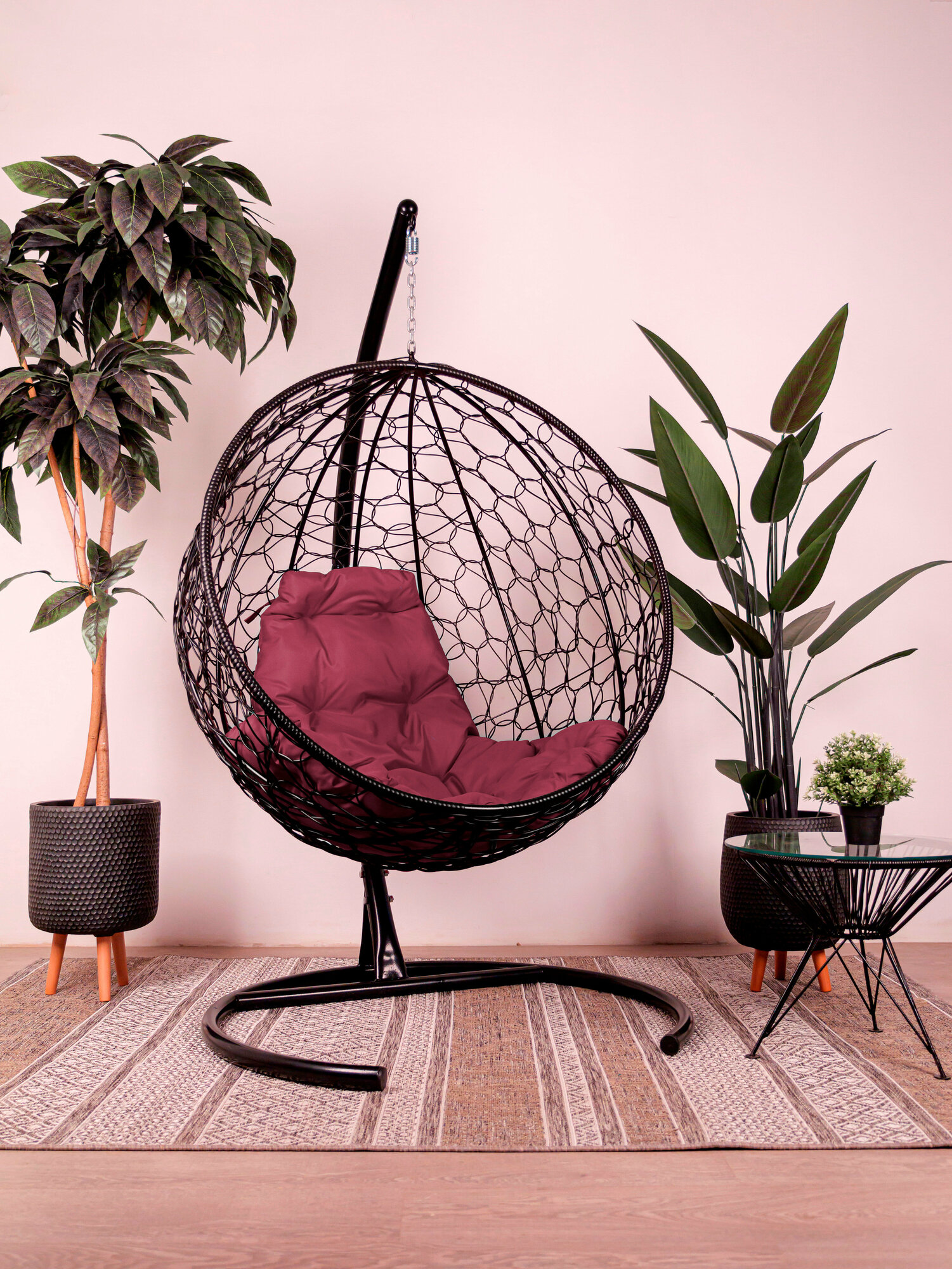 СохранитьПодвесное кресло Круг ротанг чёрное, бордовая подушка интересное: