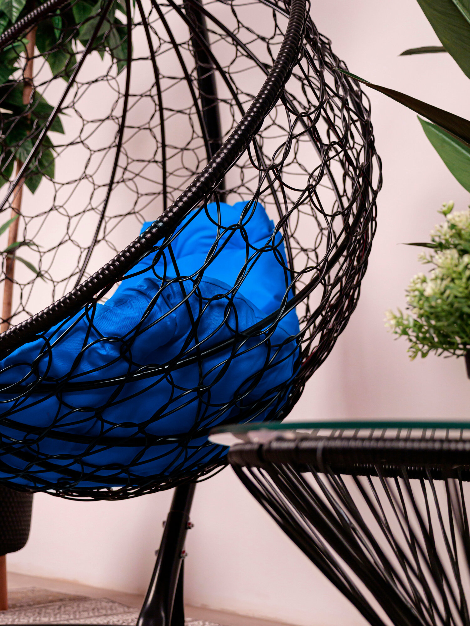 СохранитьПодвесное кресло Круг ротанг чёрное, синяя подушка интересное: