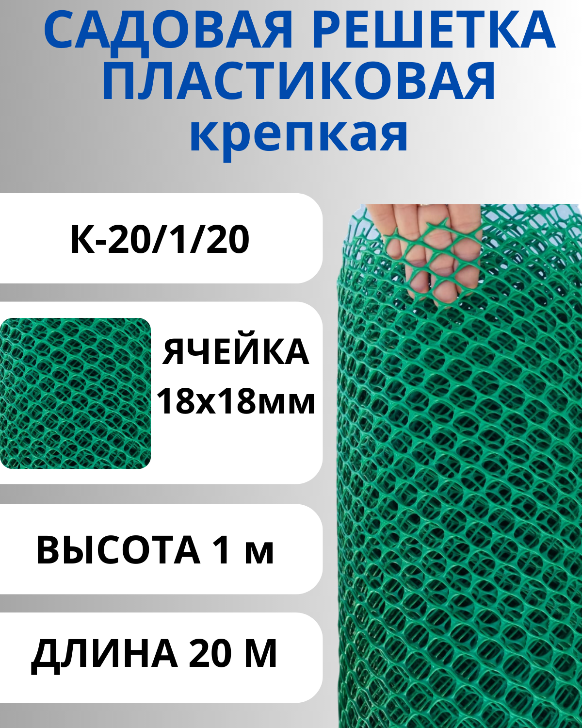К-20/1/20 Сетка пластиковая Крепкая ячейки 20х20 мм, рулон 1х20 метров зеленый