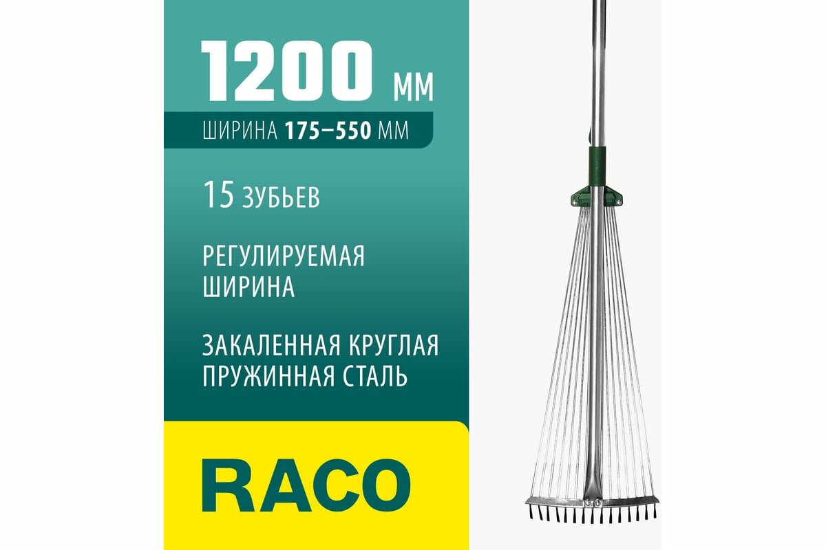 Raco Грабли веерные регулируемые, длина 1200 мм, ширина 175-550 мм, с черенком, 15 зубцов, 4231-53/743 интересное: