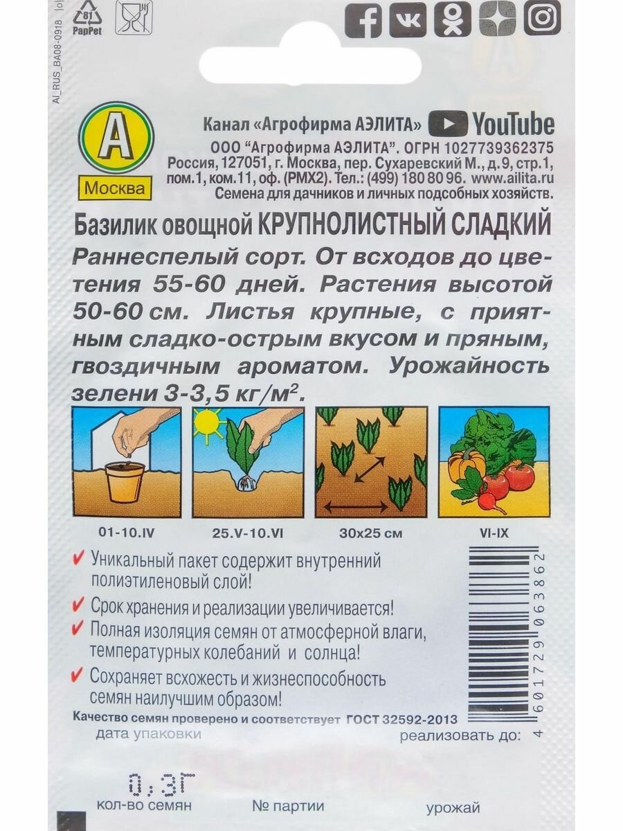 СохранитьСемена Базилик овощной "Крупнолистный" сладкий "Лидер", 0,3 г , интересное: