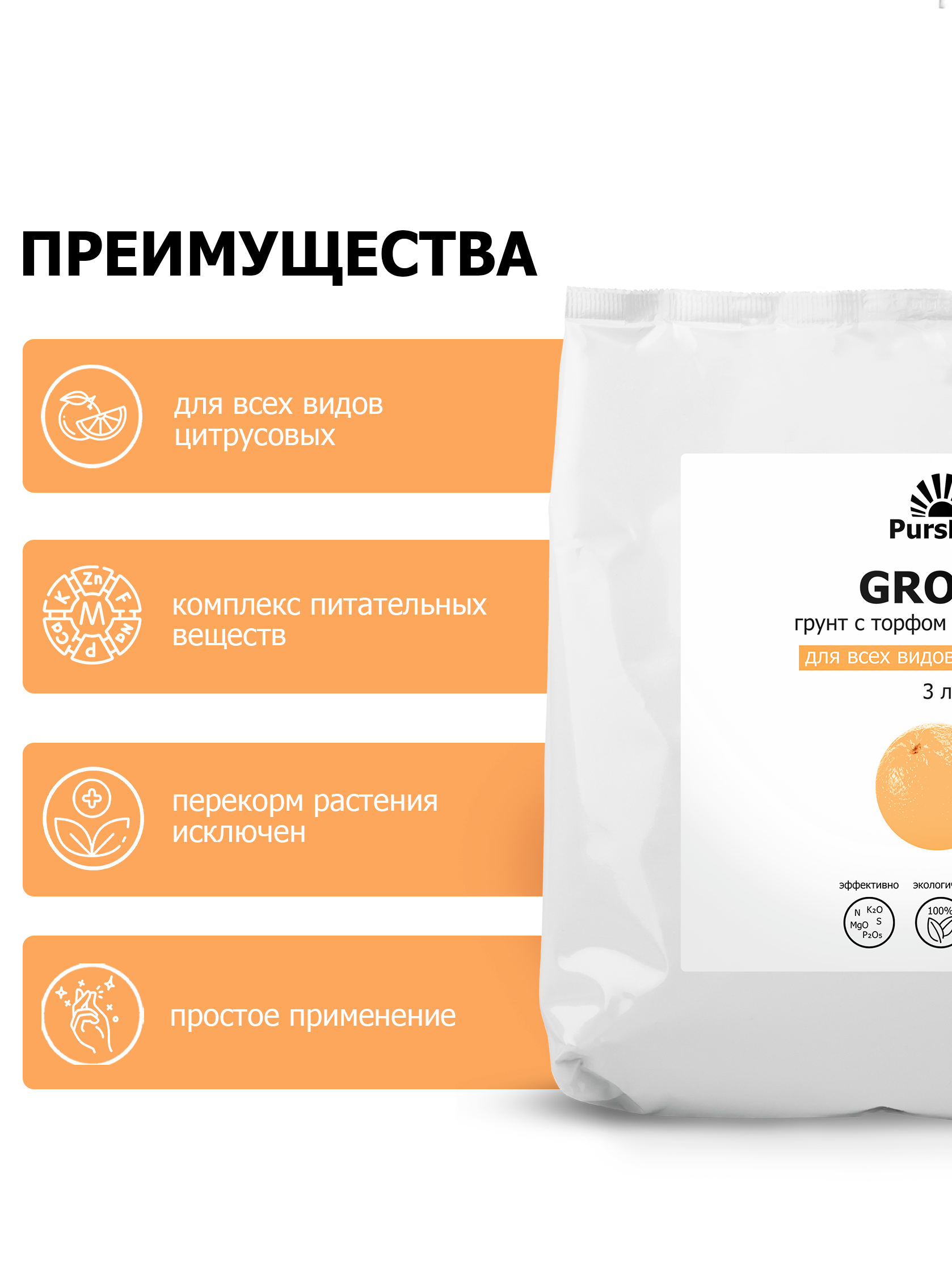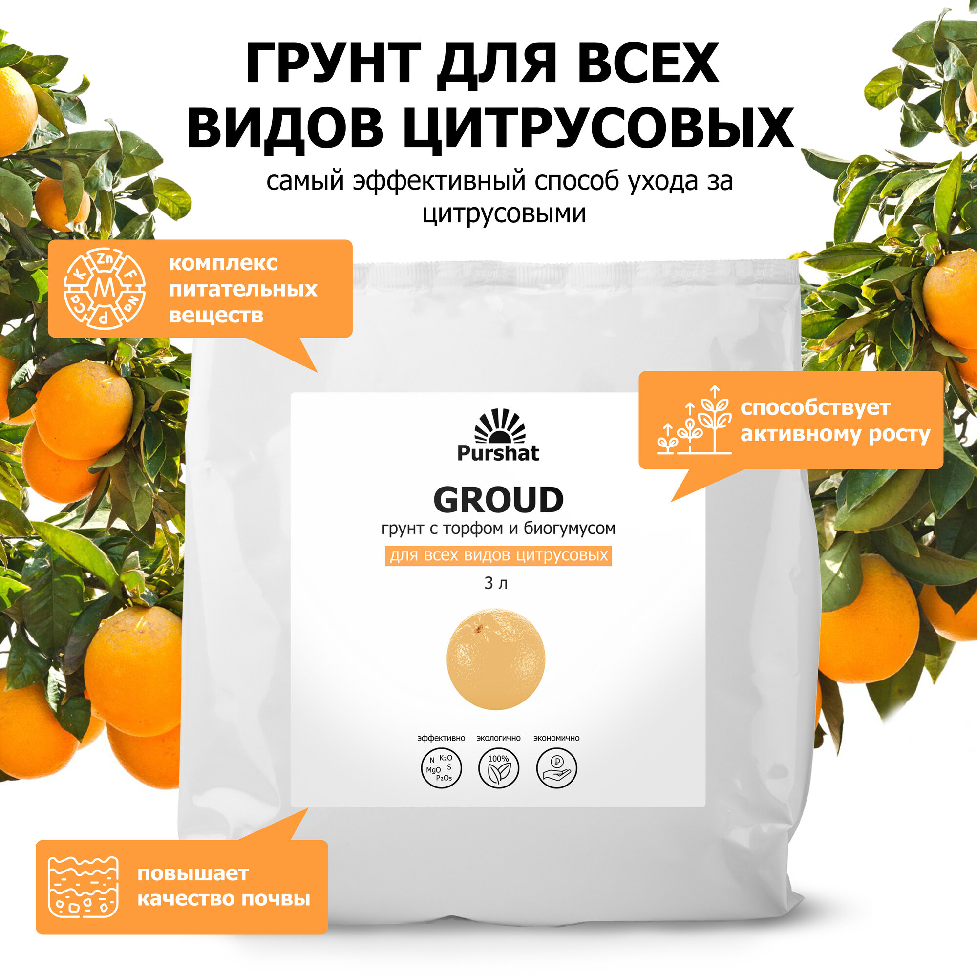 Купить Грунт (земля) для цитрусовых (лимон, мандарин, авокадо) Пуршат. Питательный почвогрунт с торфом и биогумусом (Purshat) 3 л