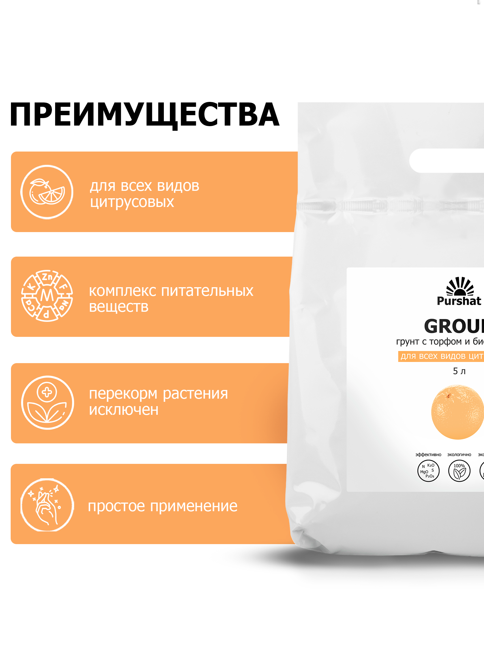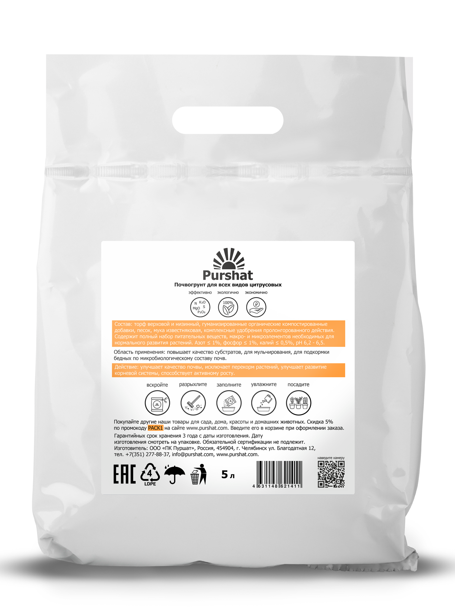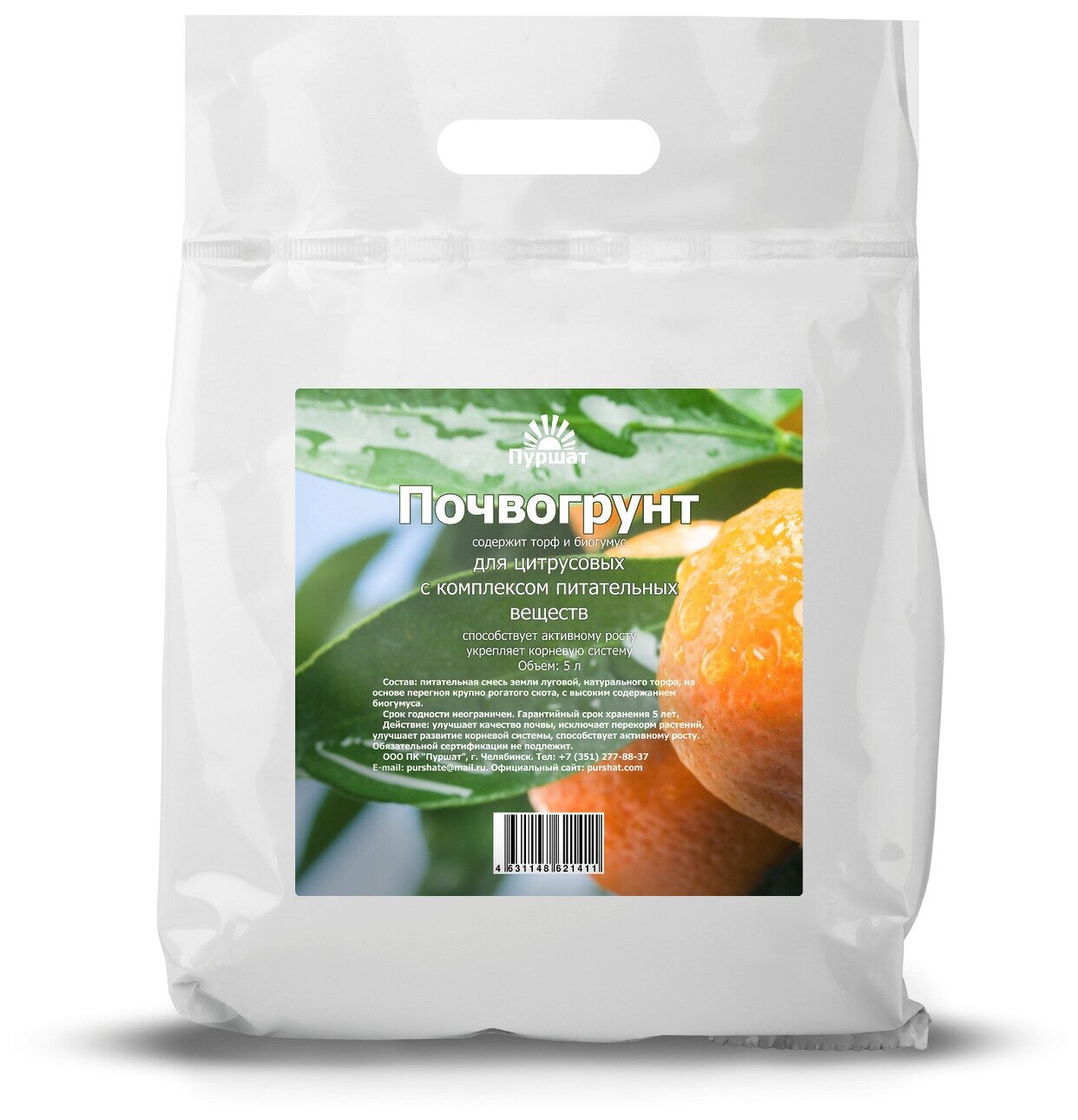 Купить Грунт (земля) для цитрусовых (лимон, мандарин, авокадо) Пуршат. Питательный почвогрунт с торфом и биогумусом (Purshat) 5 л