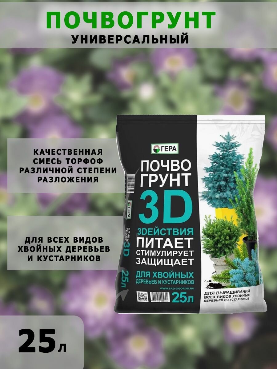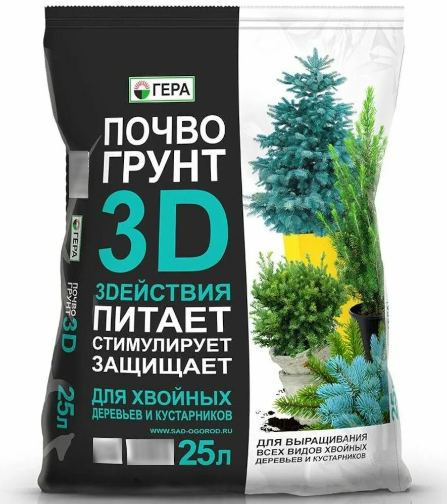 | Состав | Почвогрунт Гера 3D для хвойных деревьев и кустарников, 25 л, 6.7 кг |