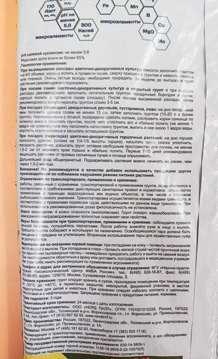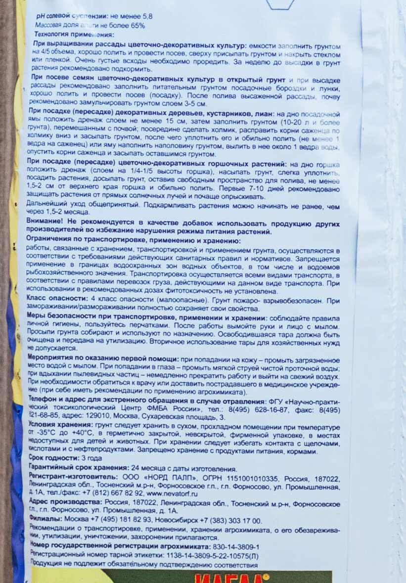 | Основные питательные вещества в мг/л, не менее | Азот (NH4+NO3) 150 Фосфор (P2O5) 270 Калий (K2O) 300 pH солевой суспензии 6,0-6,5 |