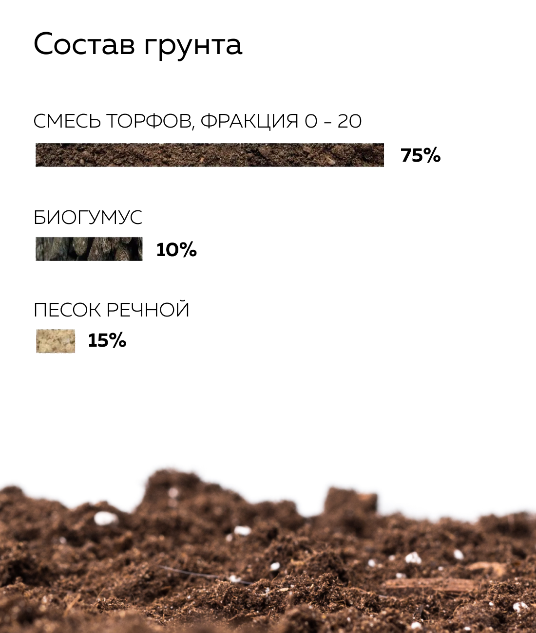 | Состав | верховой торф различной степени разложения, природные структурирующие компоненты (очищенный речной песок), биогумус, комплексное минеральное удобрение |