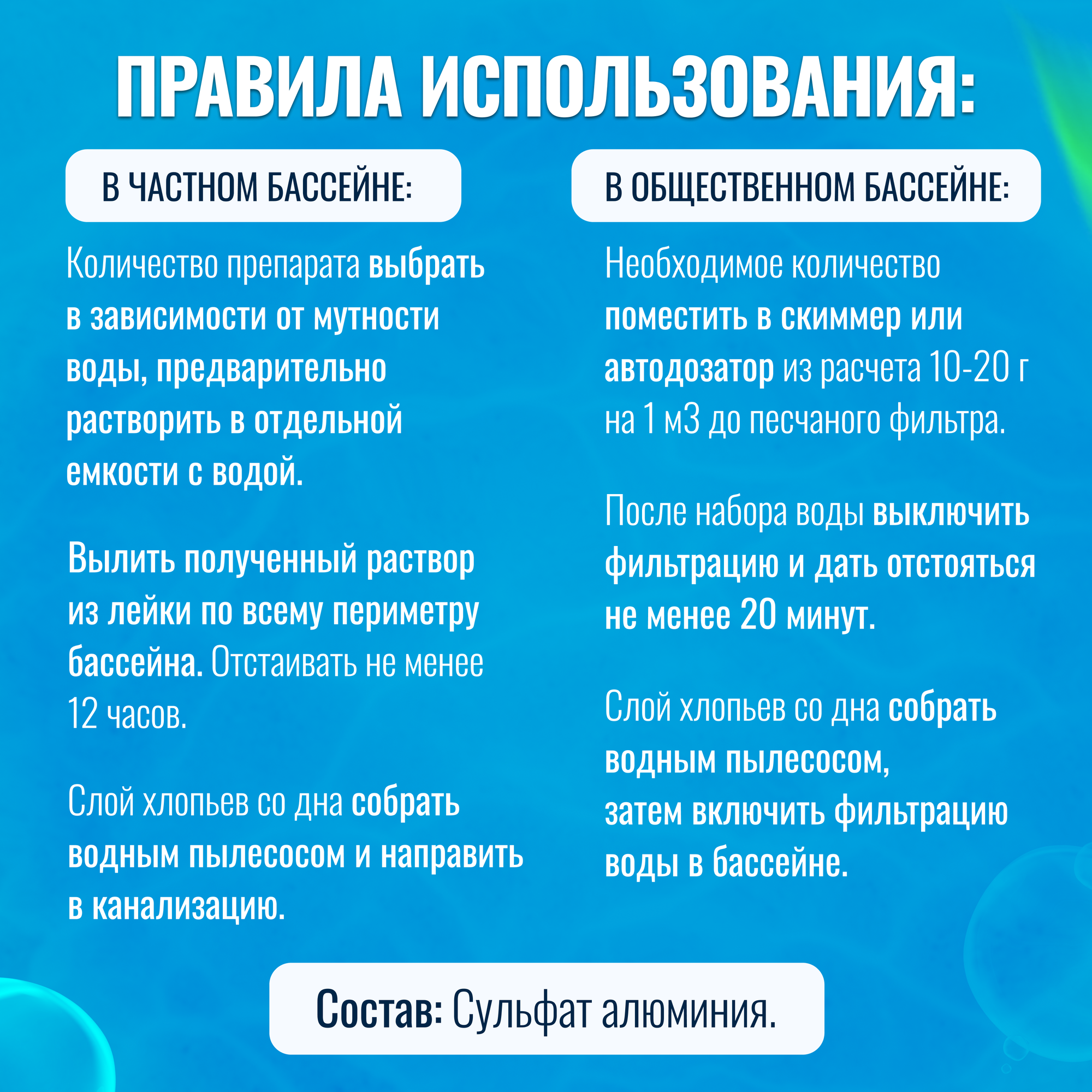 | Дополнительная информация | Во время действия коагулянта возможен эффект «белёсой» воды, который пропадает после выпадения в осадок хлопьев и взвеси |