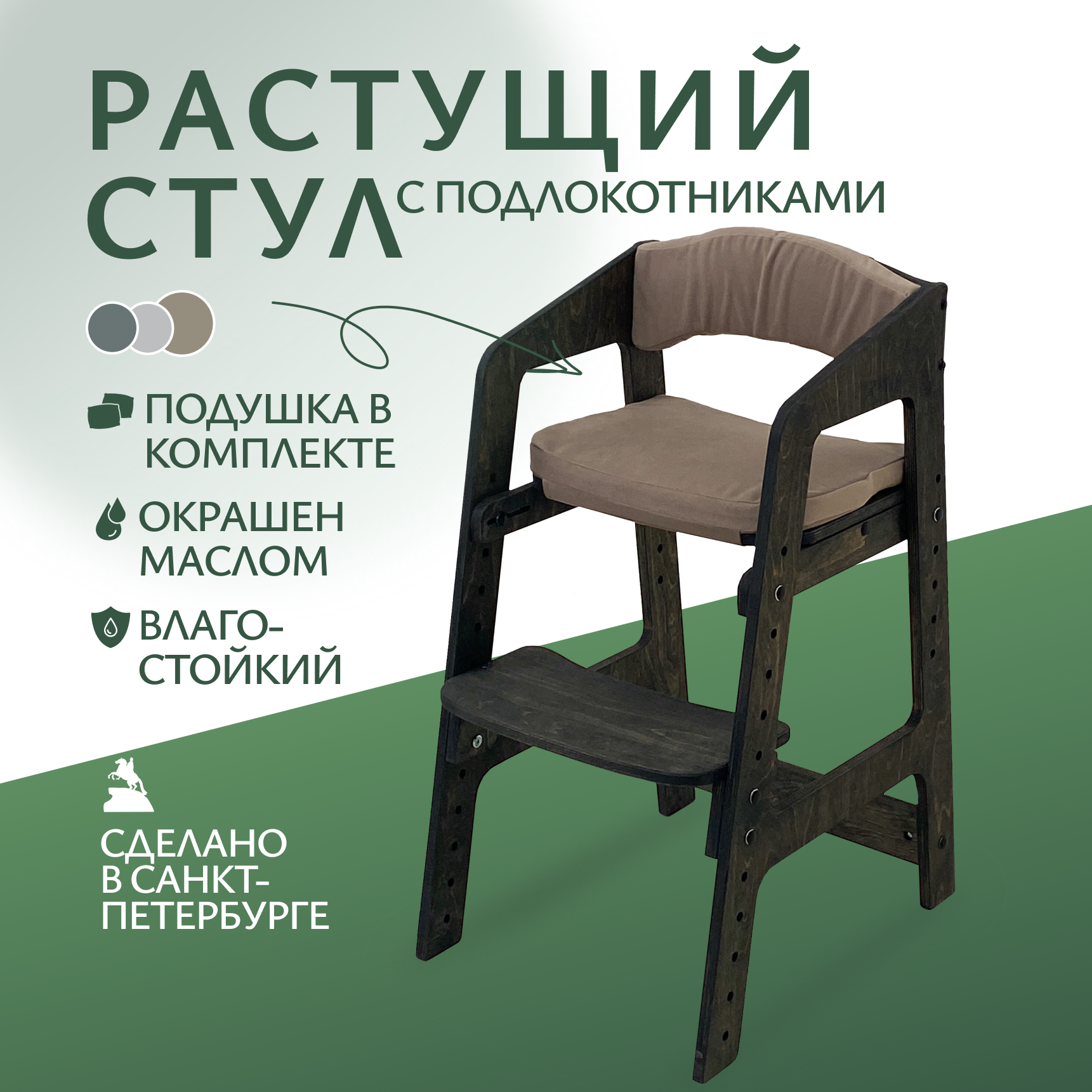 Растущий стульчик для детей Непоседа. Темный орех. Подушки хаки.