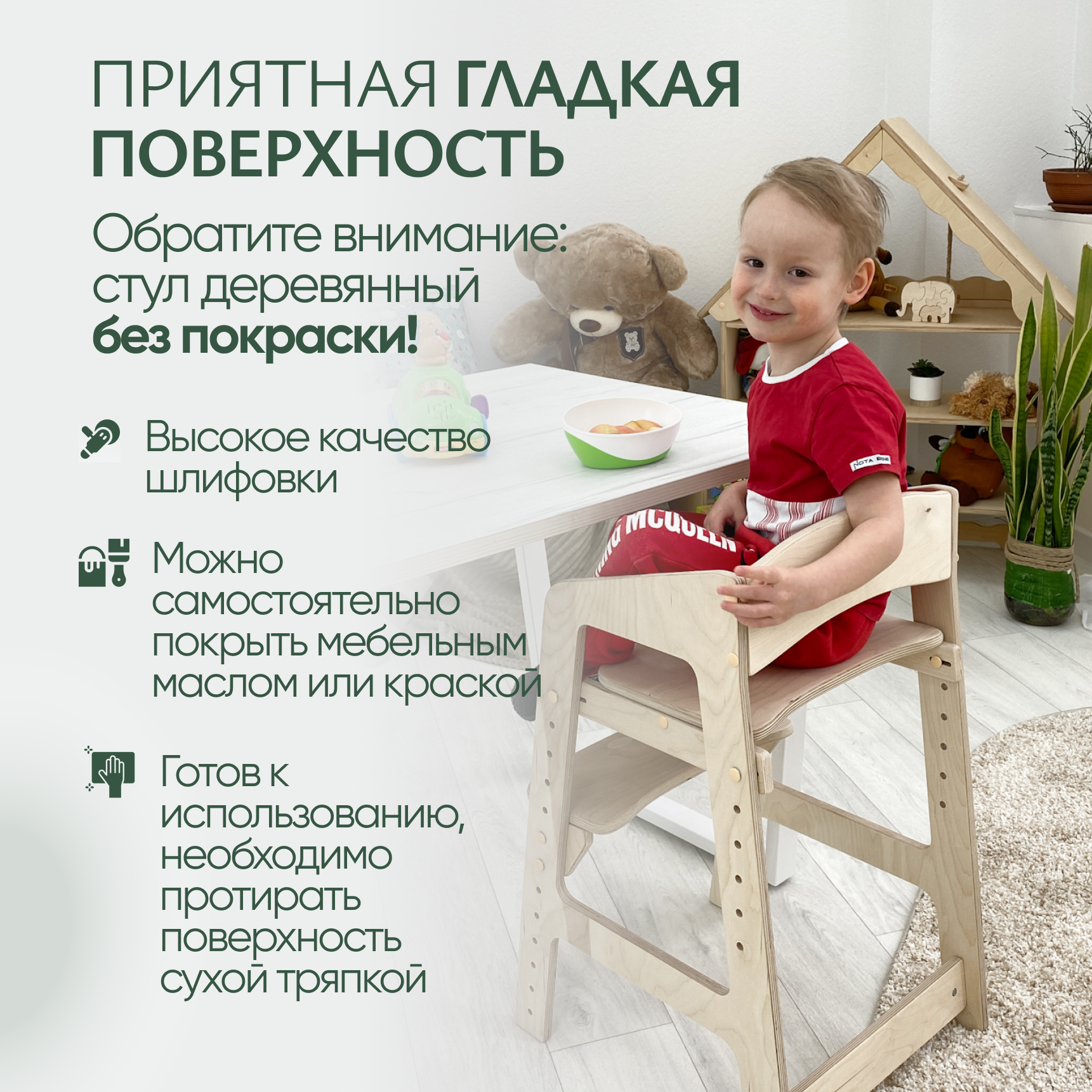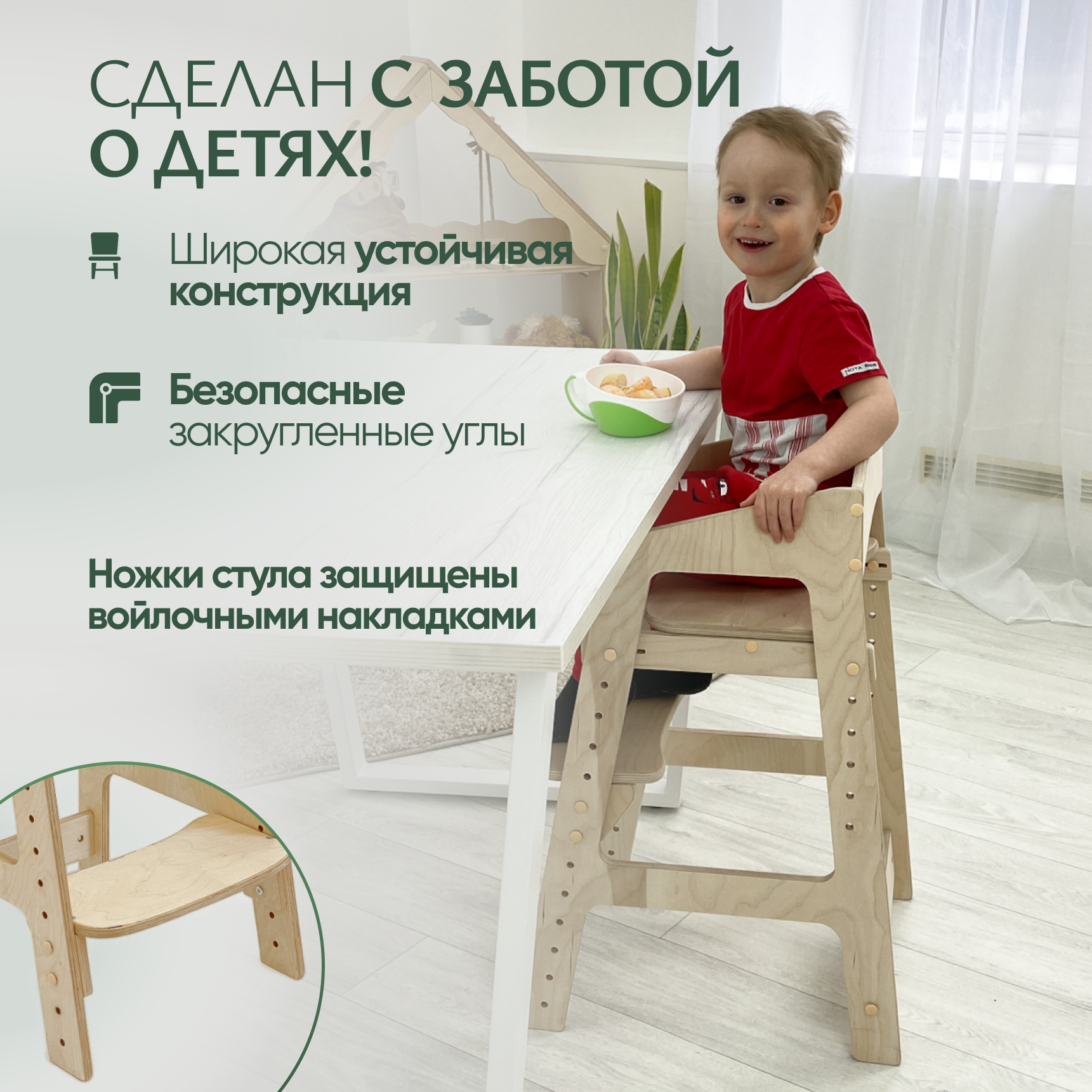 Растущий стульчик для детей Непоседа. Прозрачное масло. Подушки хаки.