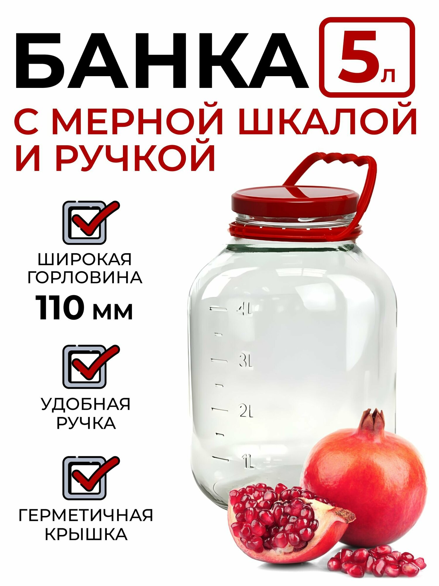Купить Банка стеклянная с мерной шкалой, крышкой и ручкой 5 литров