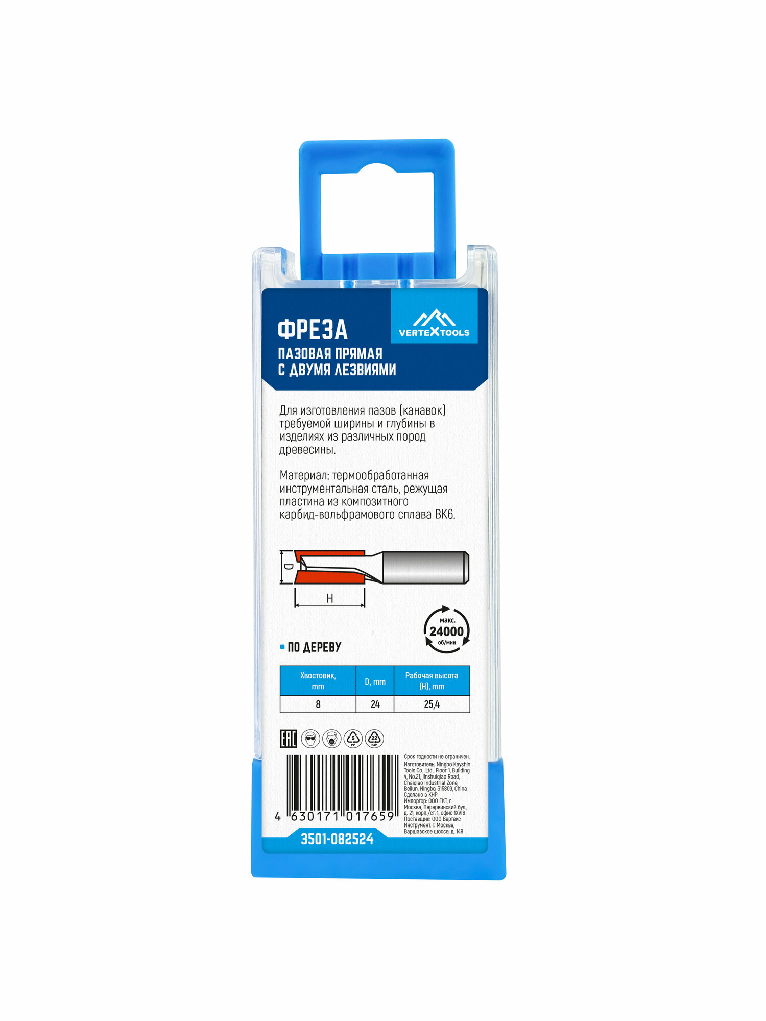 vertextools Фреза пазовая прямая с двойным лезвием хвостовик - 8мм, d-24мм, h-25,4мм, l-60,5мм 3501-082524