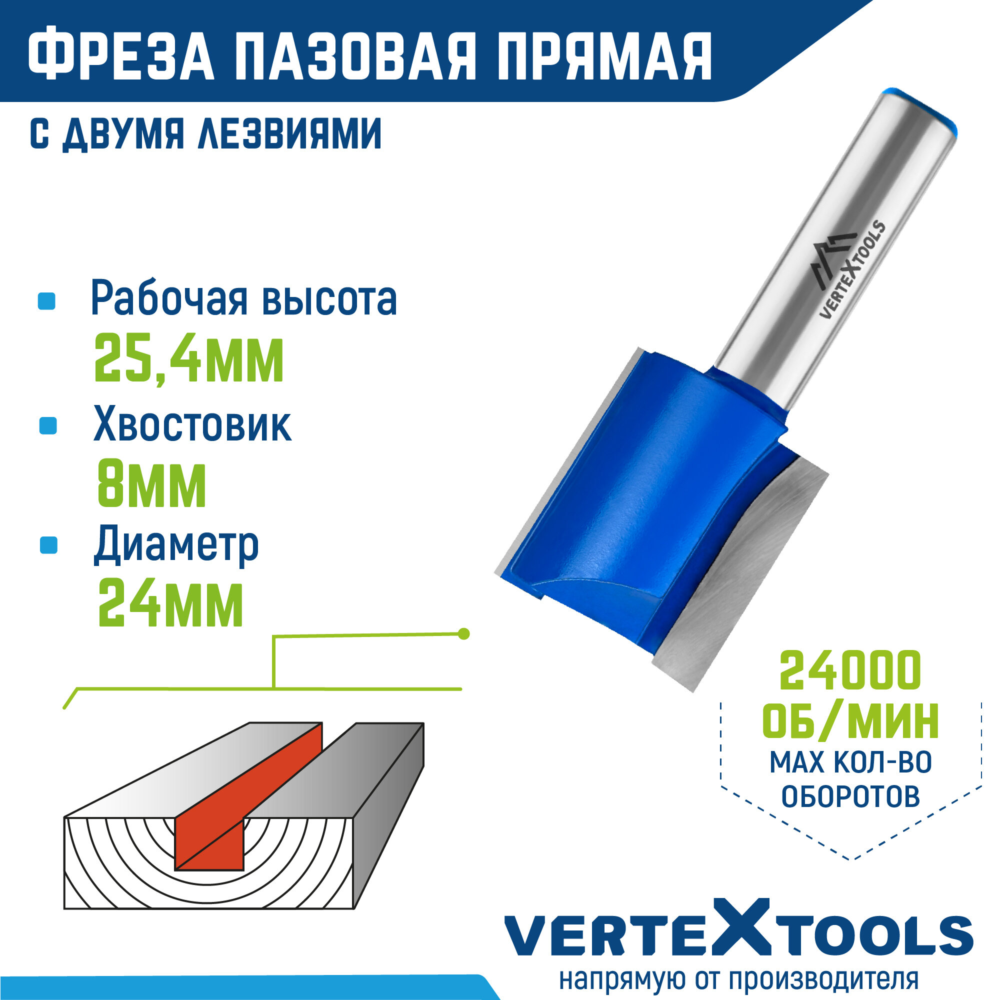 Фреза пазовая прямая VertexTools с двойным лезвием Ø 24 мм. / 8 мм. хвостовик