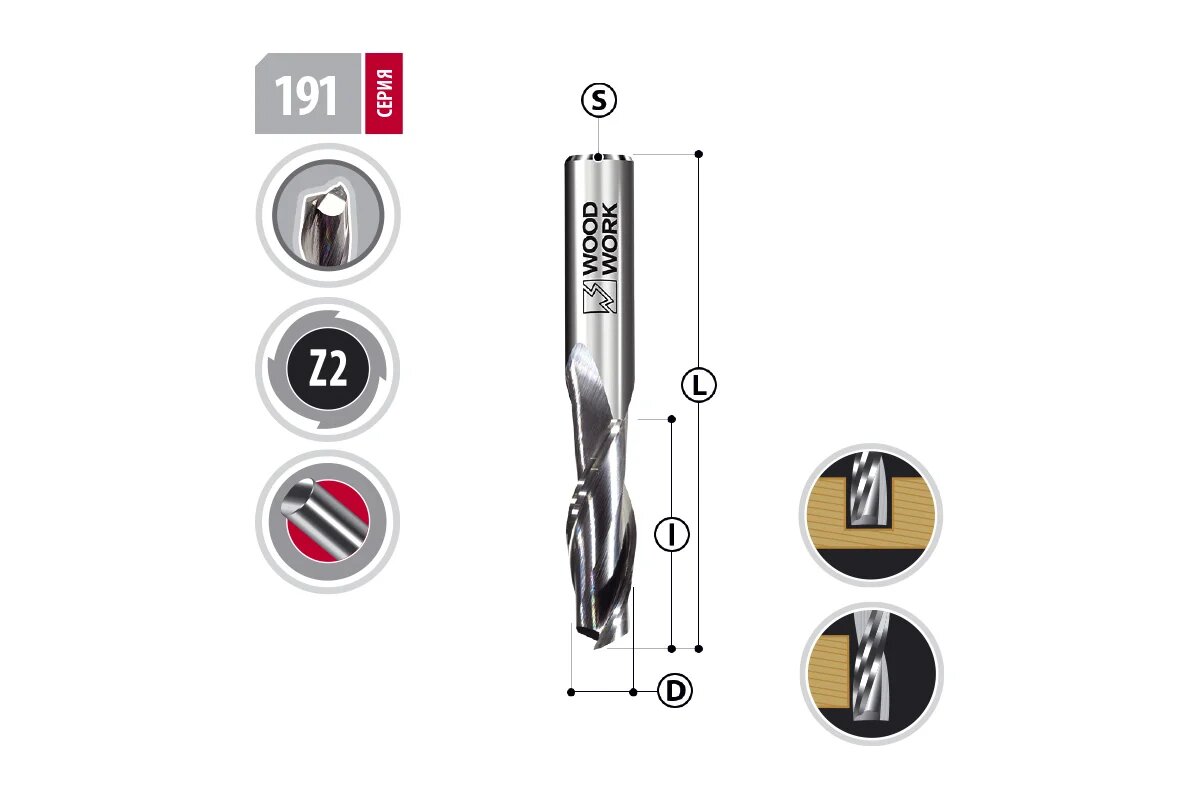 Фреза спиральная Upcut z=2 4х12х45 мм, s=4 мм WOODWORK 191.0412.45