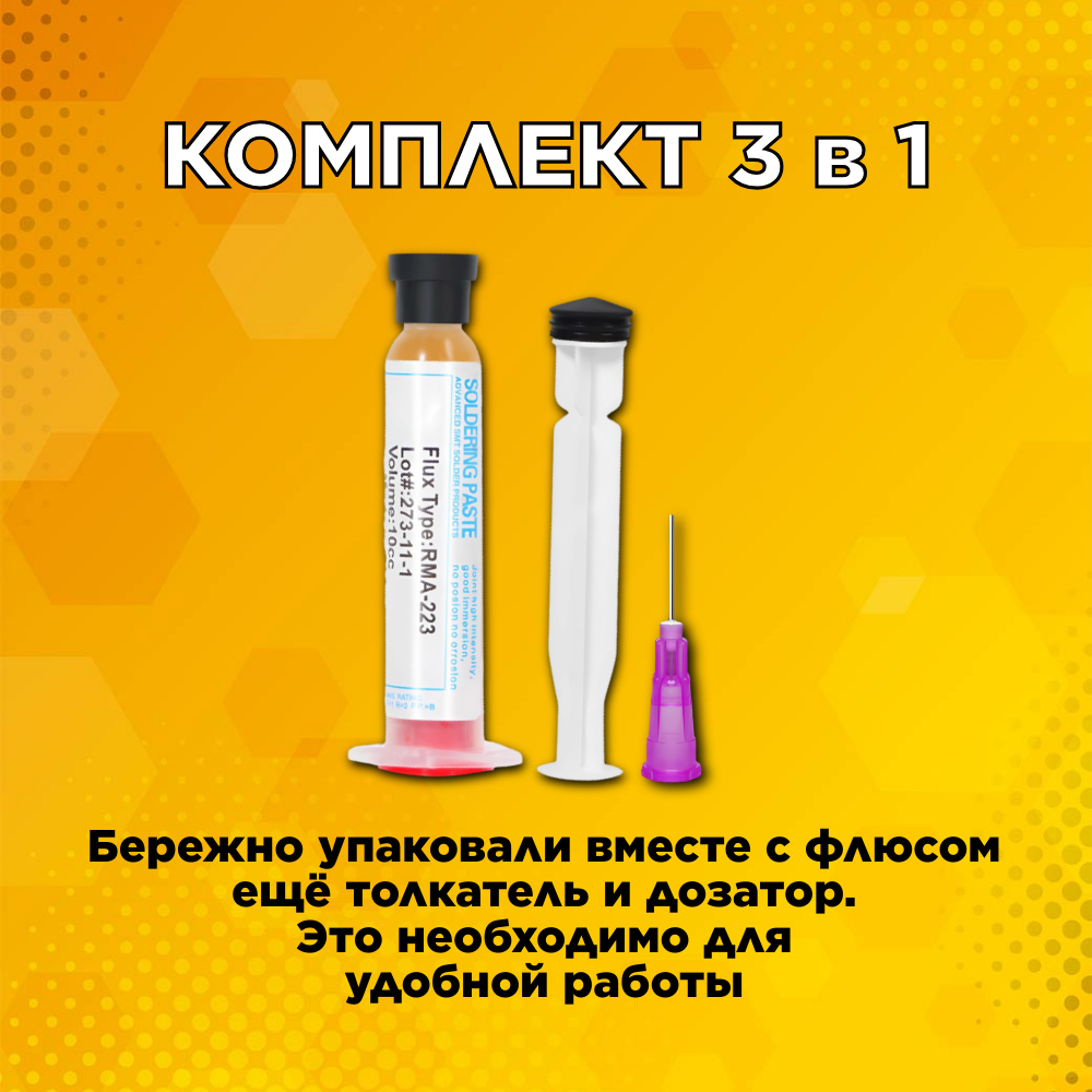| Комплектация | 2 тюбика с флюсом, шприц-толкатель, дозатор |
