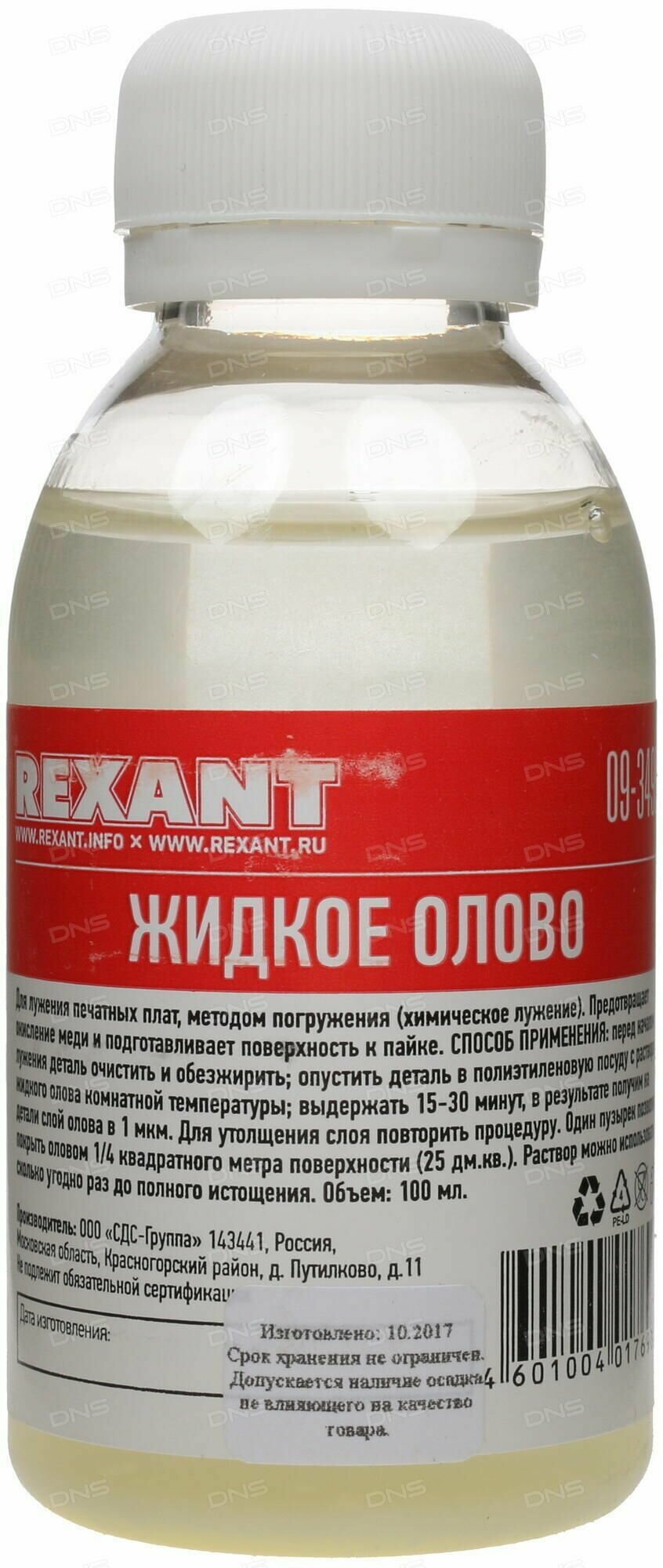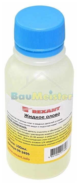 | Комплектация | Жидкое олово (химическое лужение плат) 100мл 09-3495 Rexant; упаковка |
