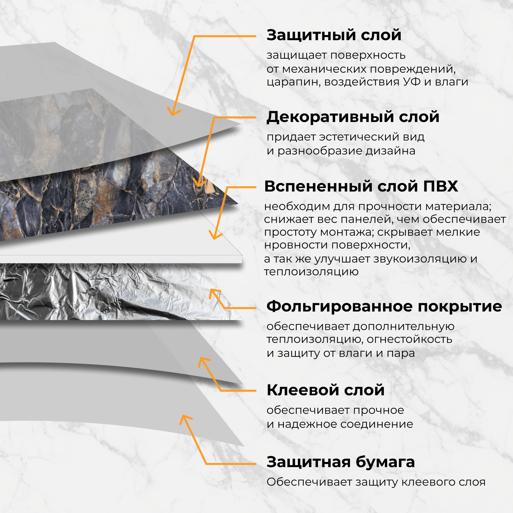 | Подробная комплектация | Самоклеящиеся стеновые панели "Белый мрамор" - 18 шт |