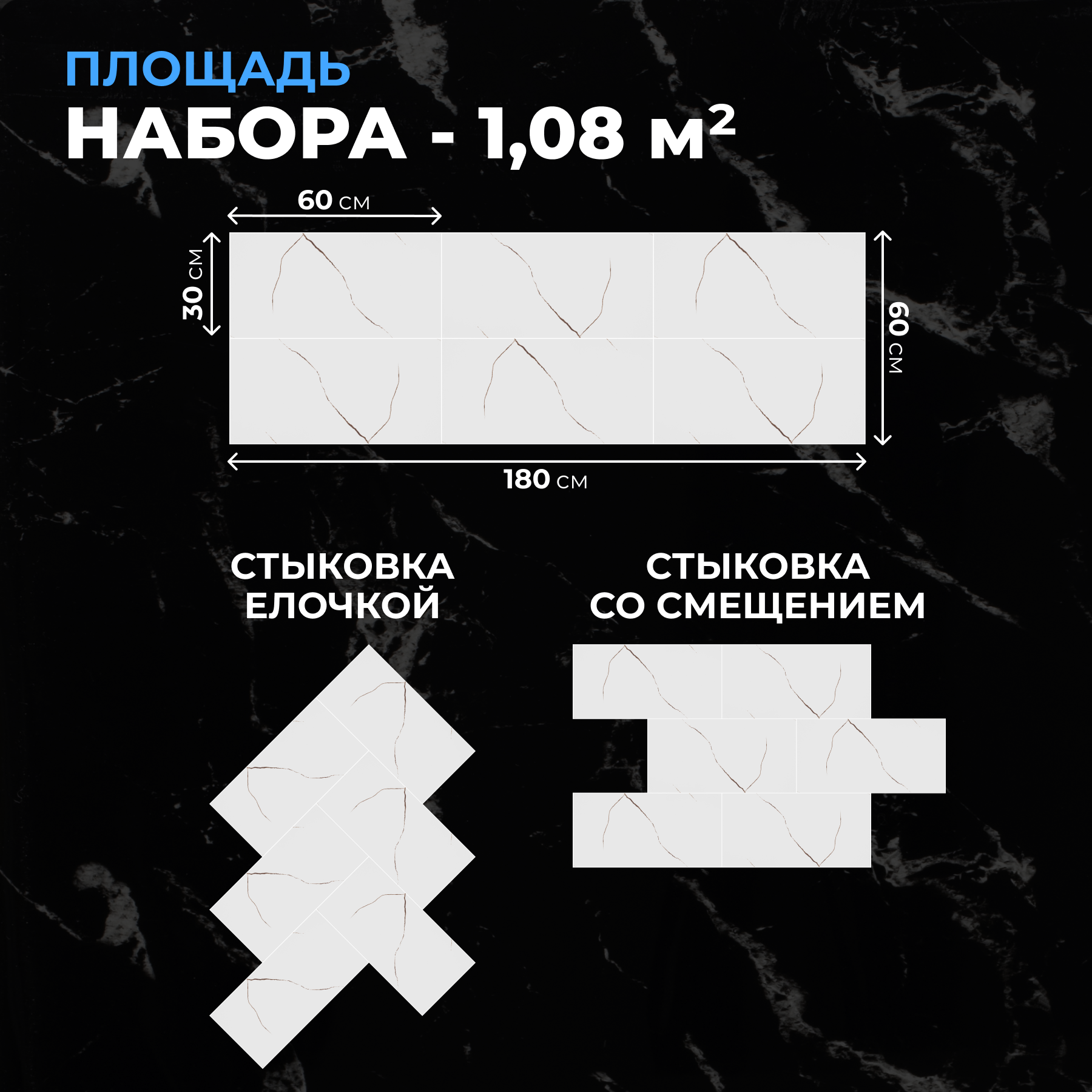 Темный мрамор, 60х30 см плитка глянцевая, самоклеющиеся панели для стен, декор для дома на кухню, в ванную (арт. 1019) 20 шт.