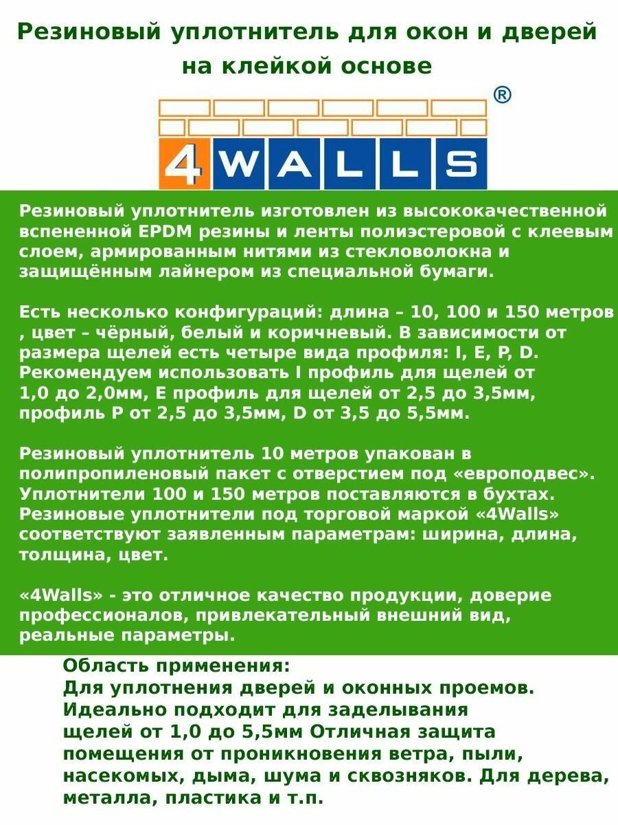 Уплотнитель для дверей и окон самоклеящийся 4WALLS E-профиль 4x9мм, 150м, коричневый URK150E
