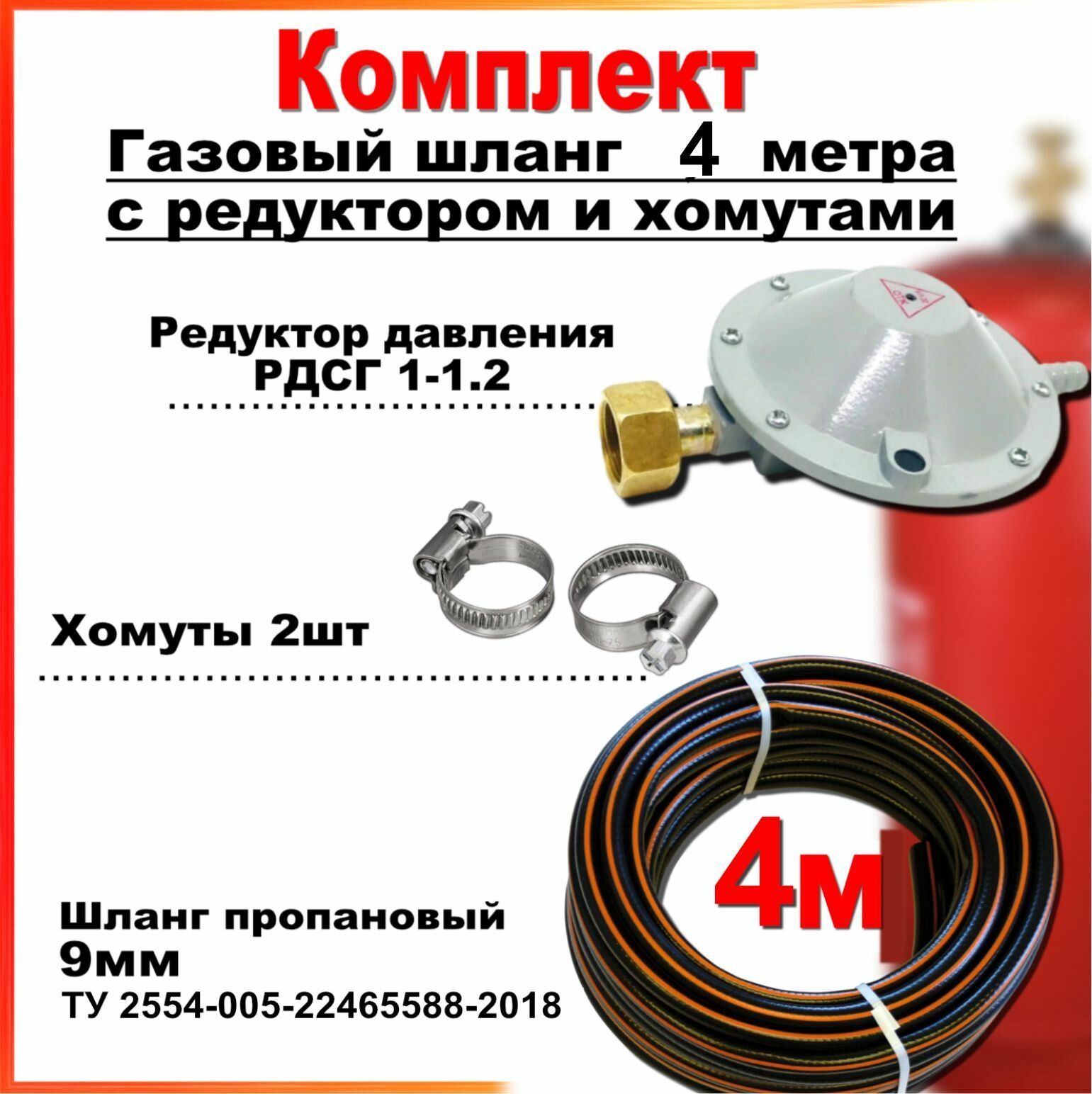 Купить Шланг пропановый газовый 9мм, 4 метра c редуктором РДСГ-1-1.2 и хомутами для подключения газовых баллонов к плитам