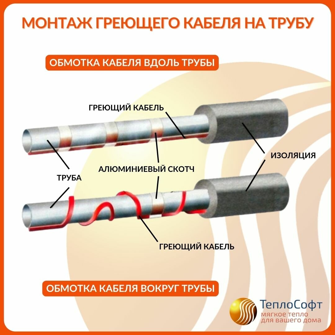 Греющий кабель на трубу саморегулирующийся 14м 224Вт / для водопровода / для водостока / обогрев труб