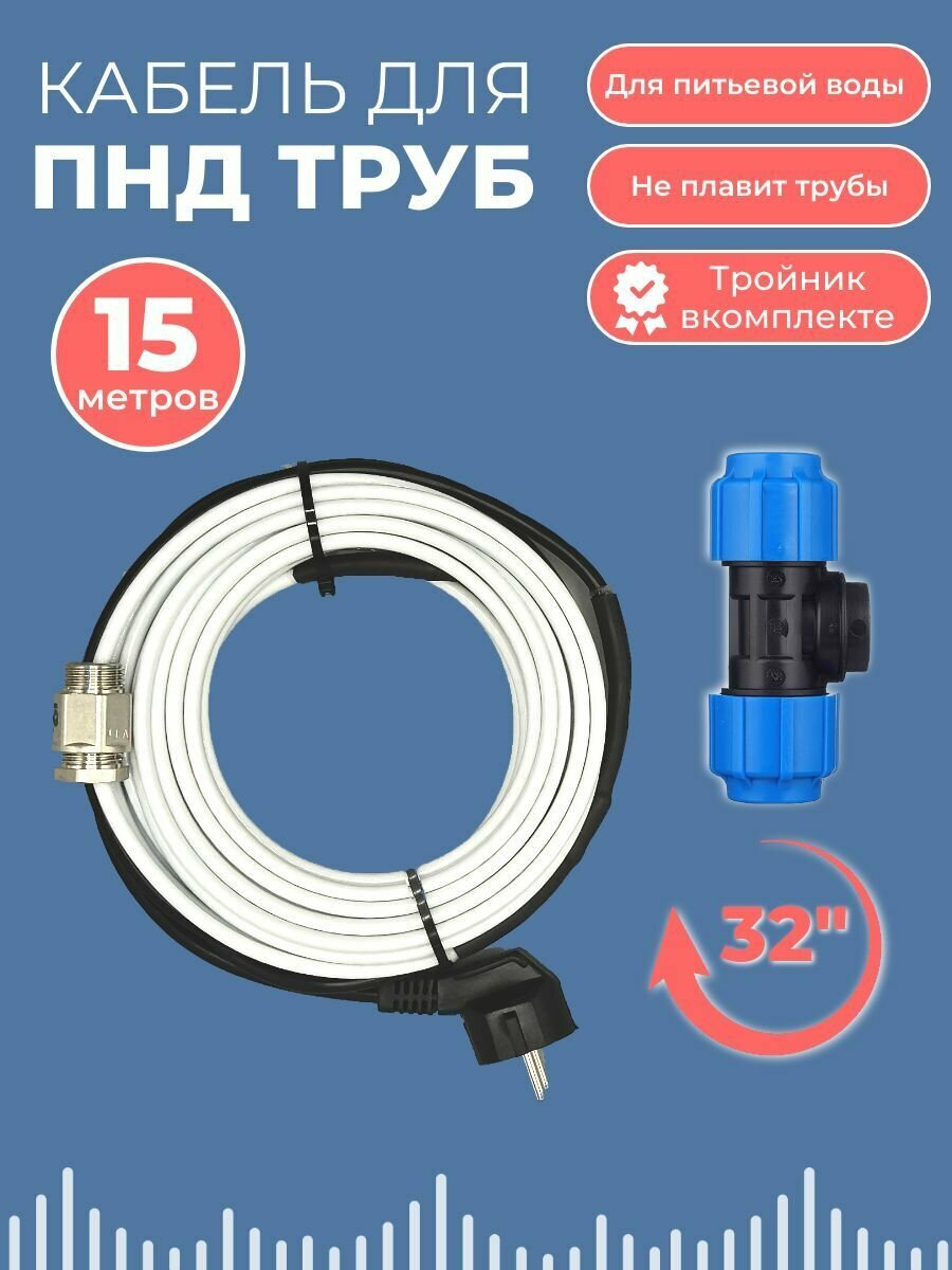 Купить Готовый комплект для обогрева труб (Греющий кабель в трубу + тройник пнд 32) 15м