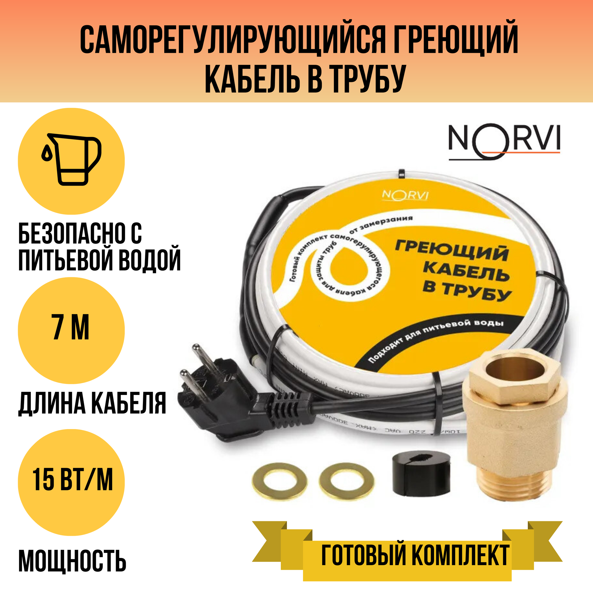 Греющий кабель NORVI, 15 Вт, 1 м, для обогрева внутри трубы