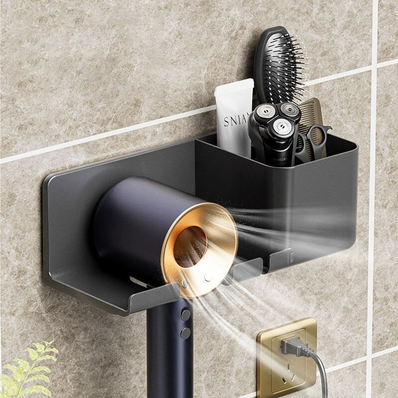 Полка для фена bLESkYOU, СЕРЫЙ, с крючком и органайзером, пластик, настенный, самоклеящийся, без сверления.