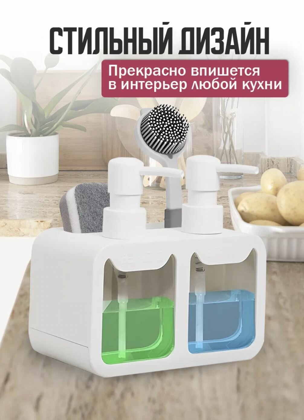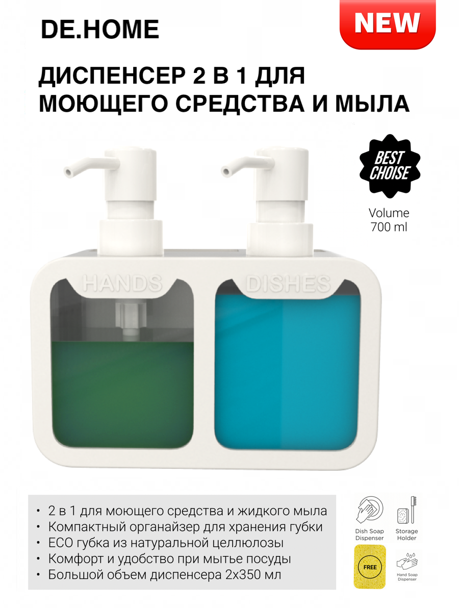 СохранитьDE.HOME Диспенсер двойной для кухни 2х350мл, в комплекте с губкой, белый интересное: