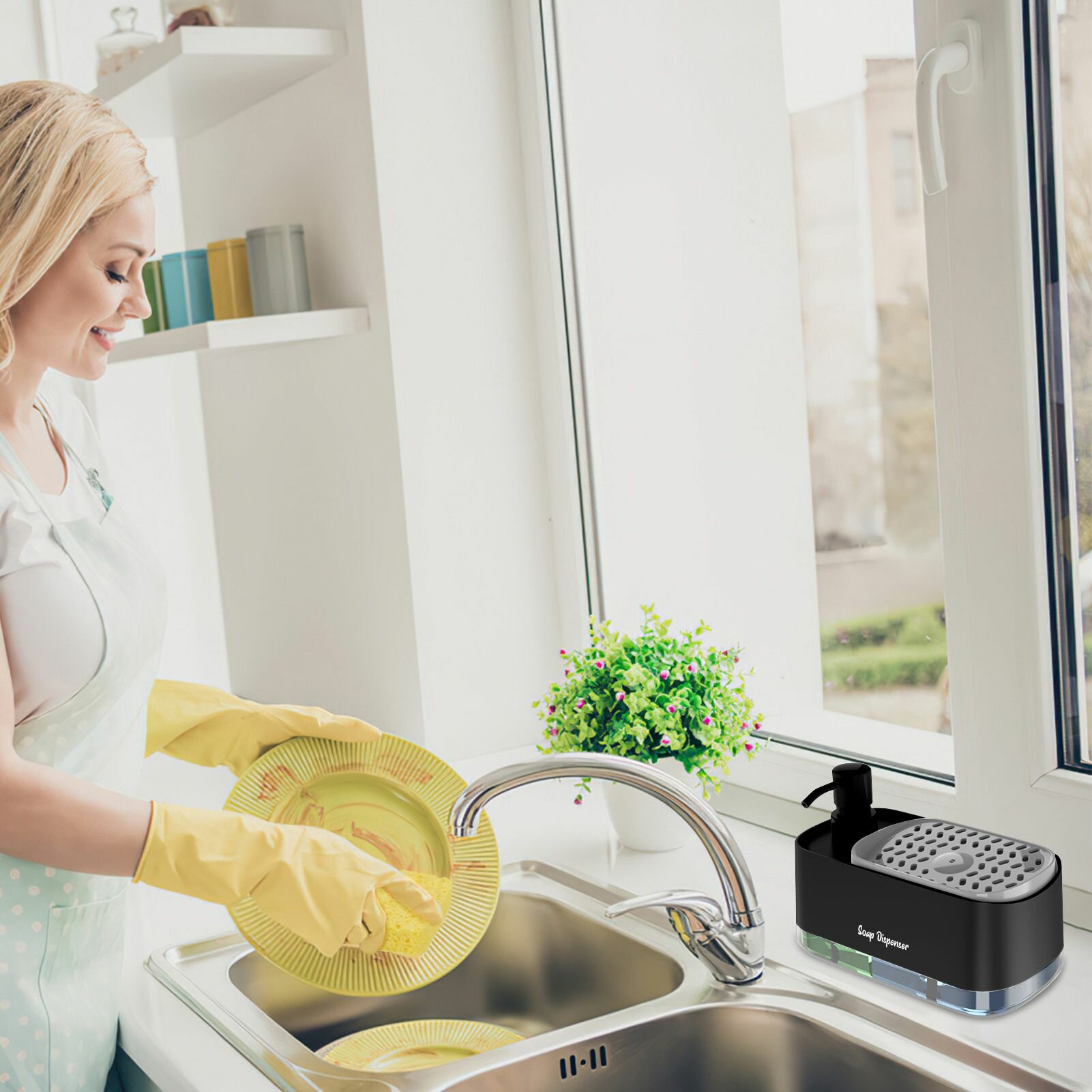 DE.HOME Диспенсер с губкой, дозатор для жидкого мыла 300 мл, с дополнительным отделением, черный