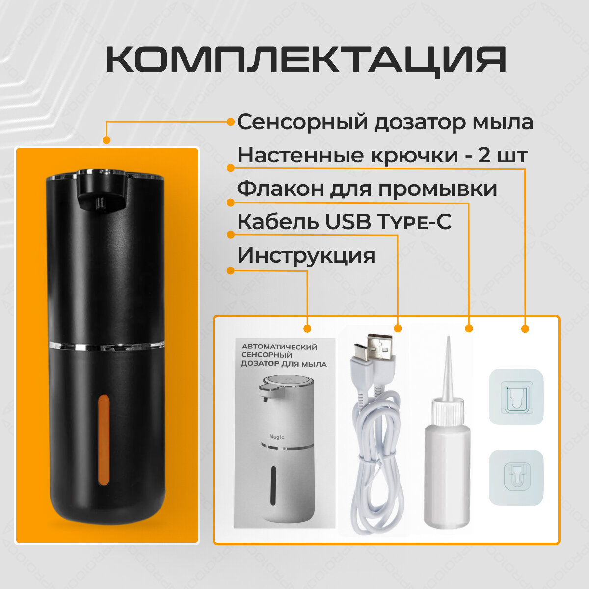 | Подробная комплектация | Сенсорный дозатор мыла 1шт. Крепления на стену 2 шт. Кабель USB Type-С 1шт. Инструкция на русском языке 1 шт. Флакон для промывки 1 шт. |