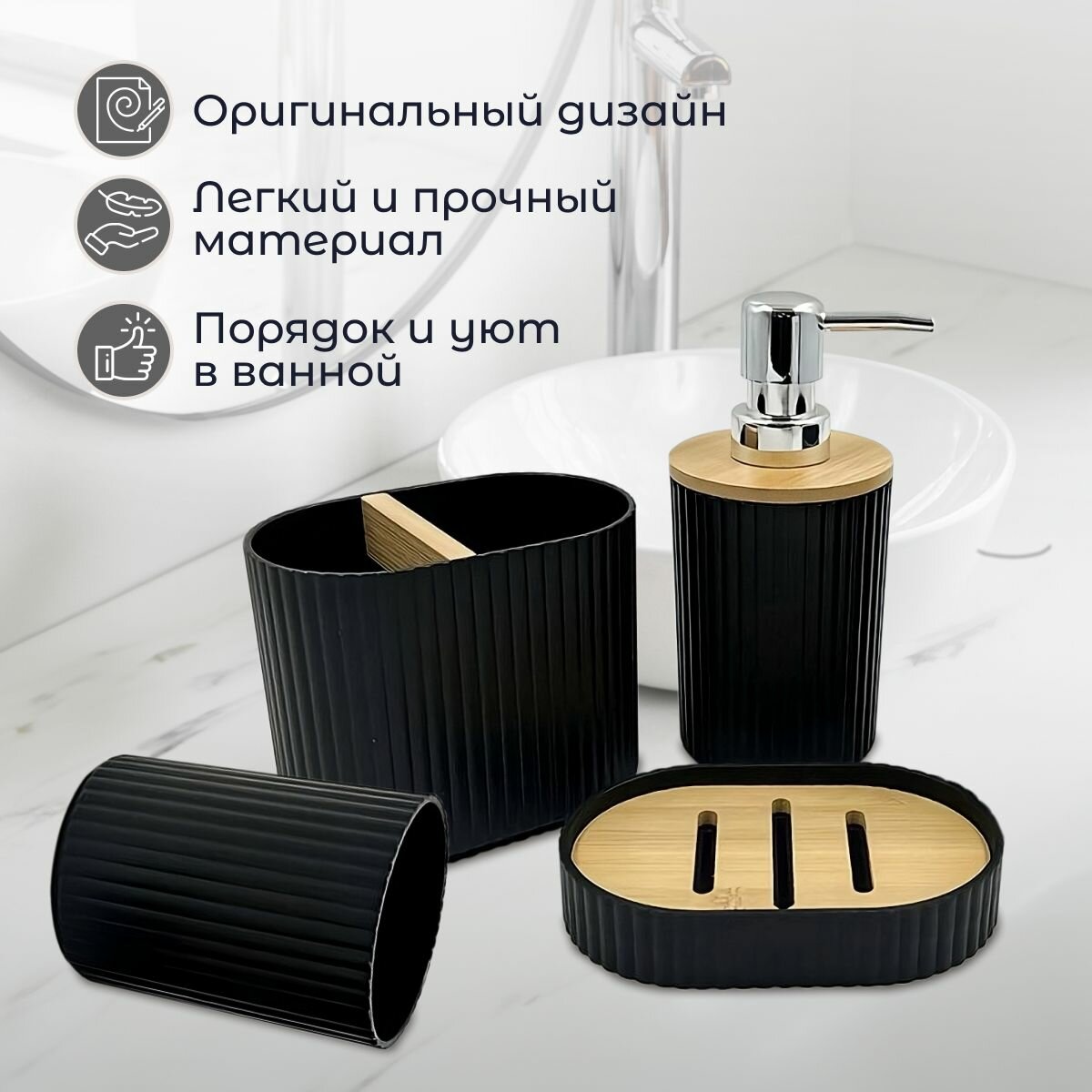 Набор аксессуаров для ванной комнаты: диспенсер для мыла, стакан для зубных щеток, стакан, мыльница; черный интересное: