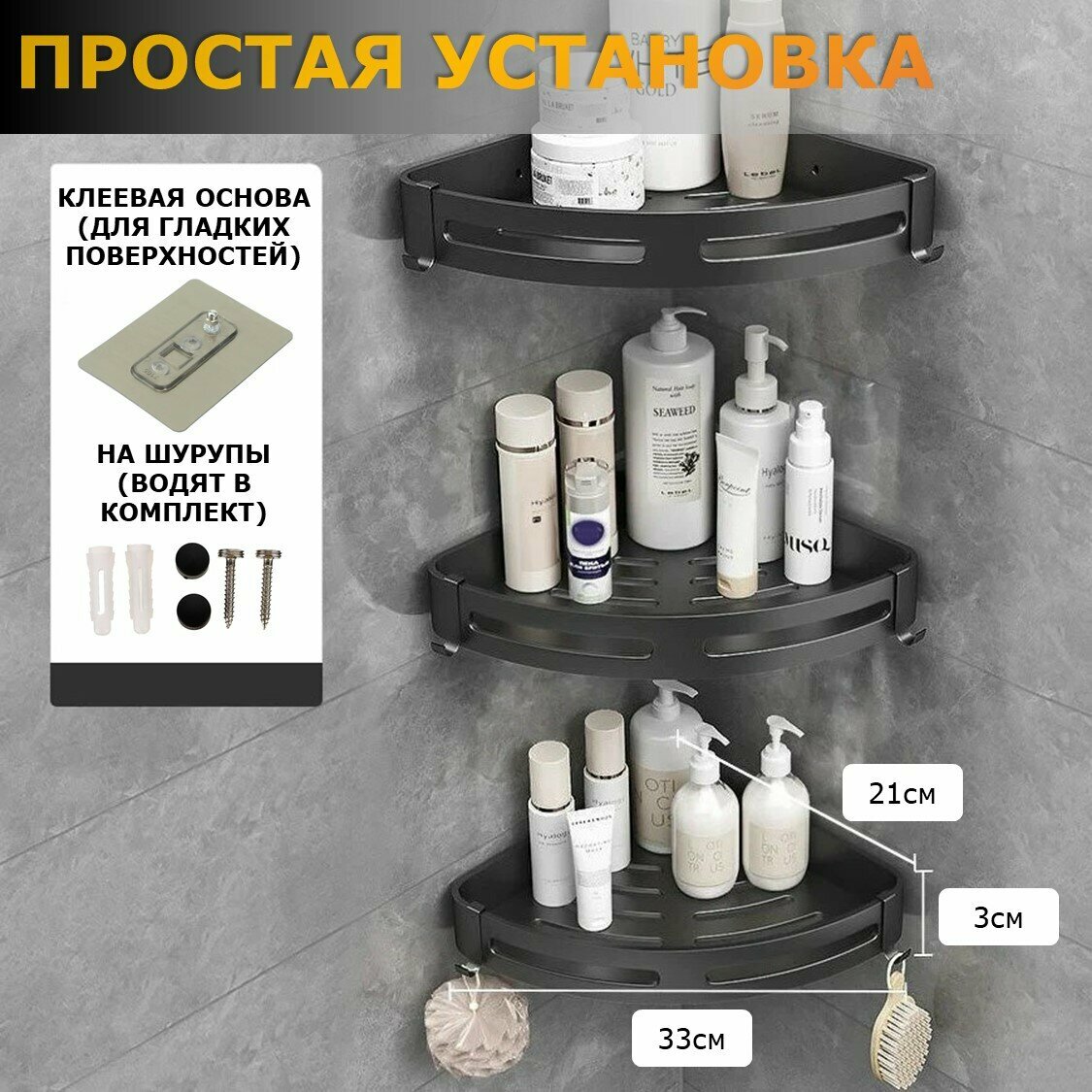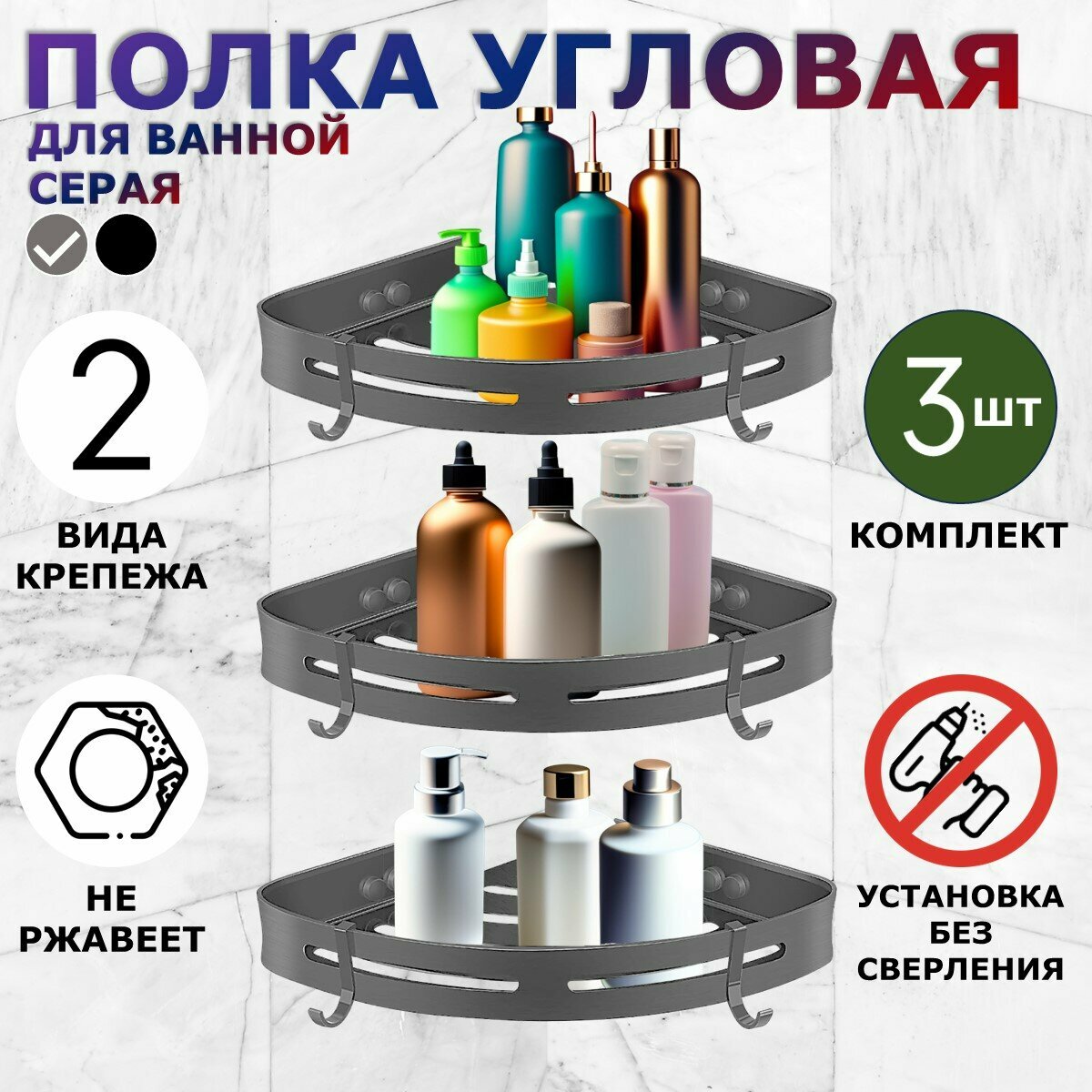 Полка для ванной угловая Ridberg, серая, без сверления, 3 шт / Полочка в ванную настенная, на кухню интересное:
