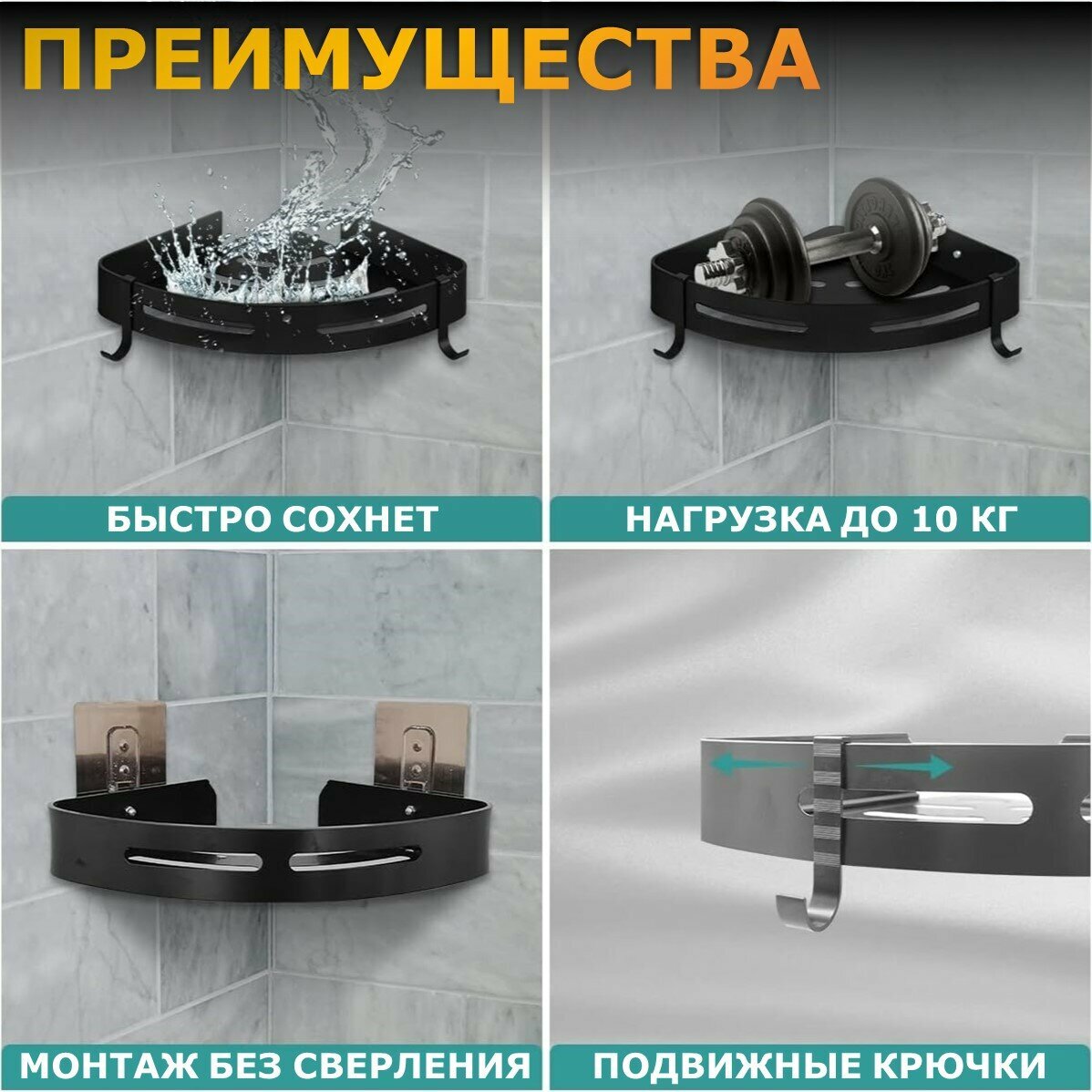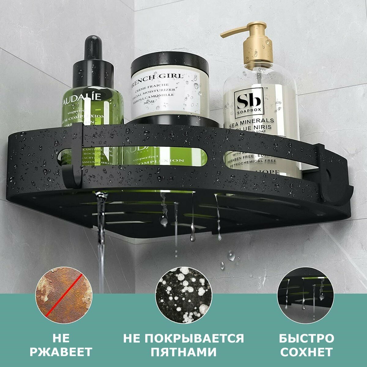 Полка для ванной угловая Ridberg, черная, без сверления, 3 шт / Полочка в ванную настенная, на кухню