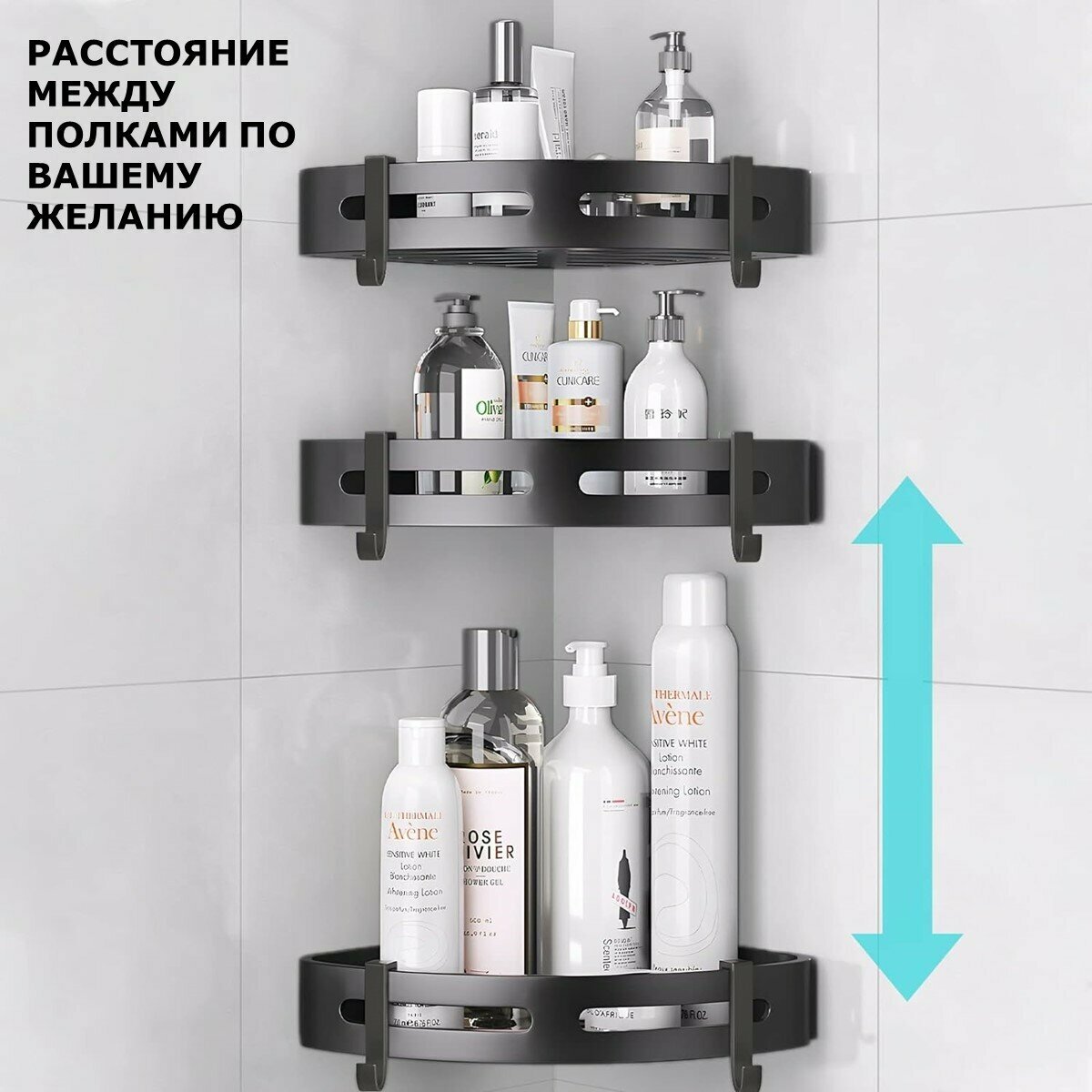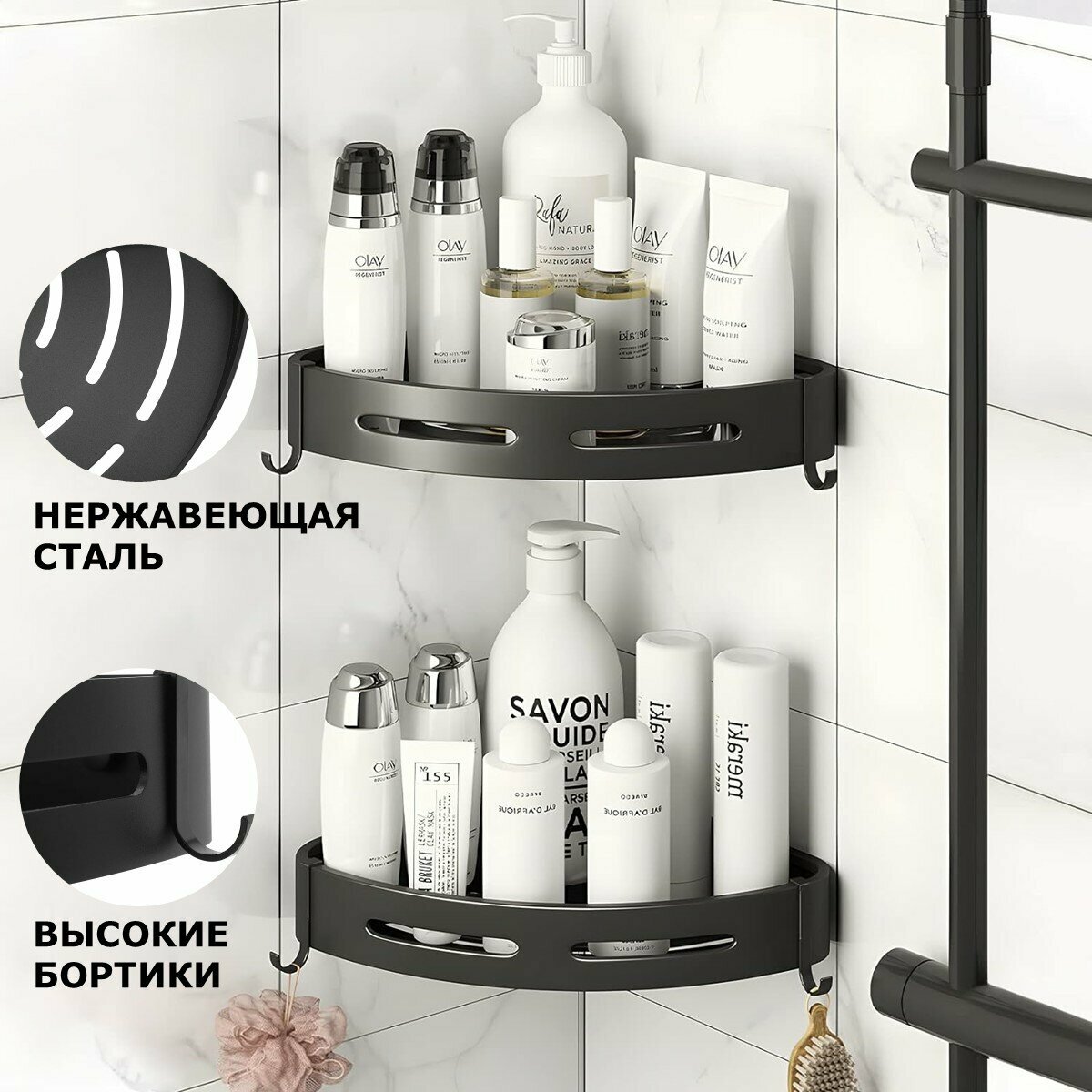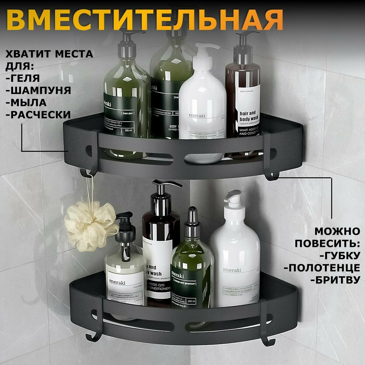 Угловая полка для ванной Ridberg, черная, самоклеящаяся, 3 шт. / Органайзер в ванную