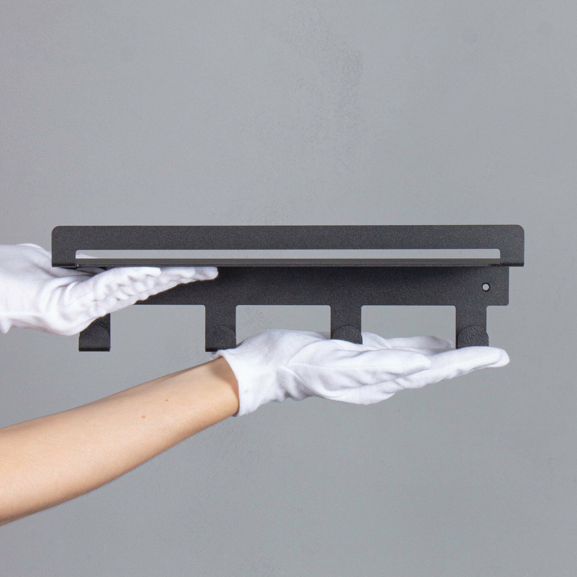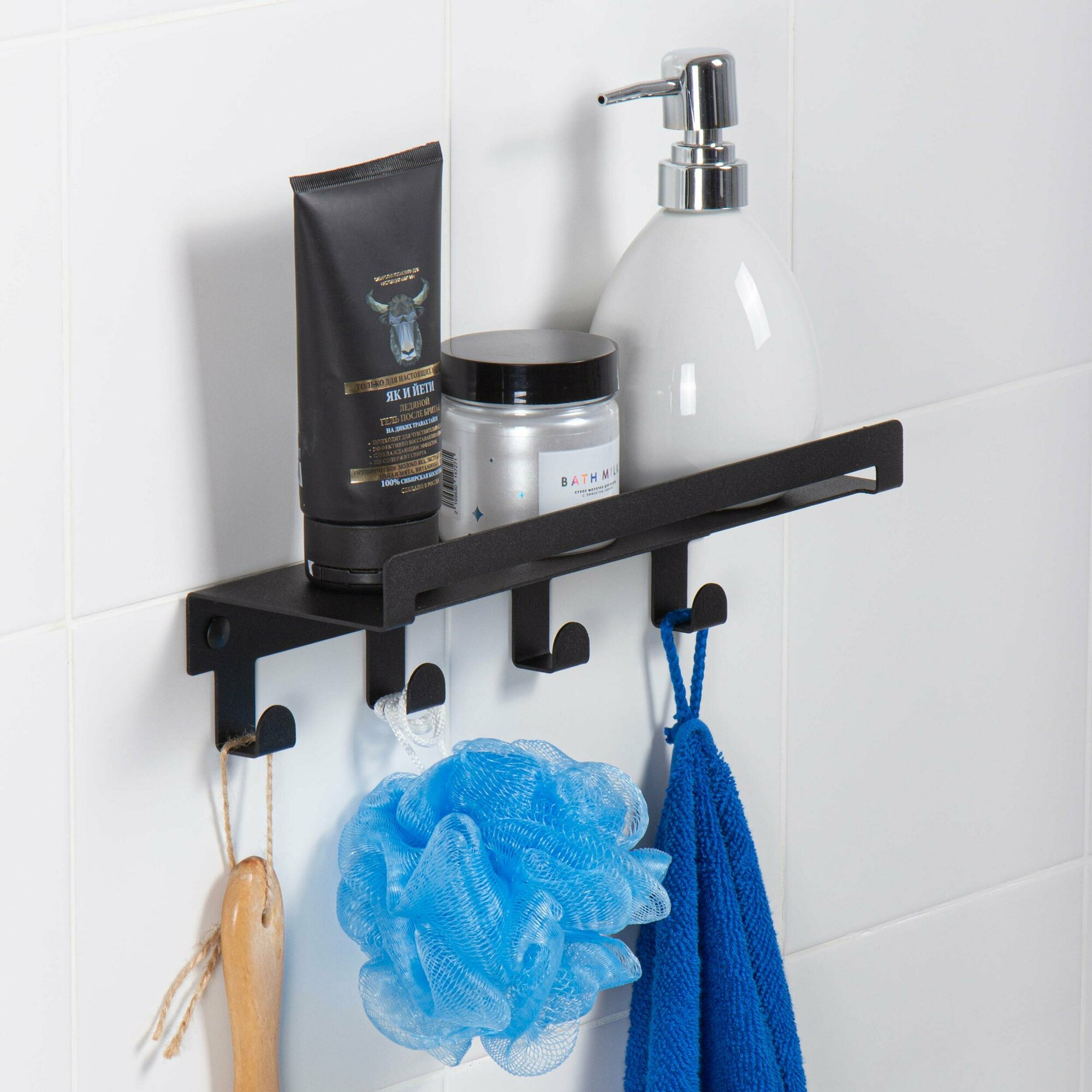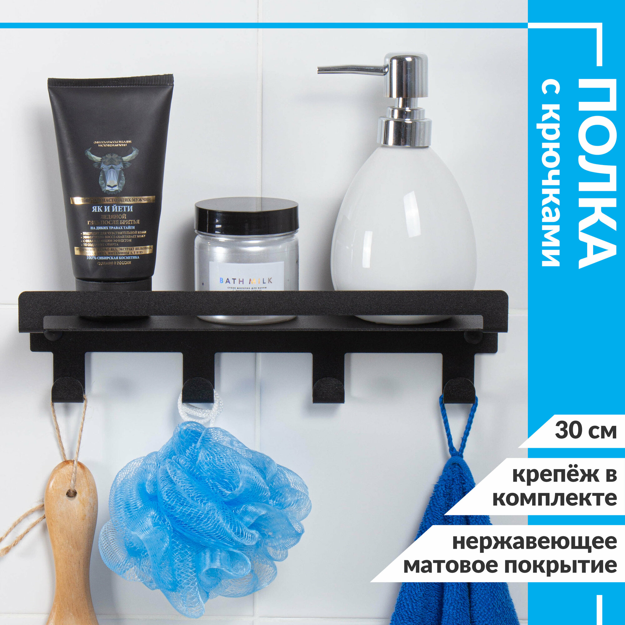 Полка для ванной комнаты настенная прямая с крючками 30 см чёрная / металлическая интересное: