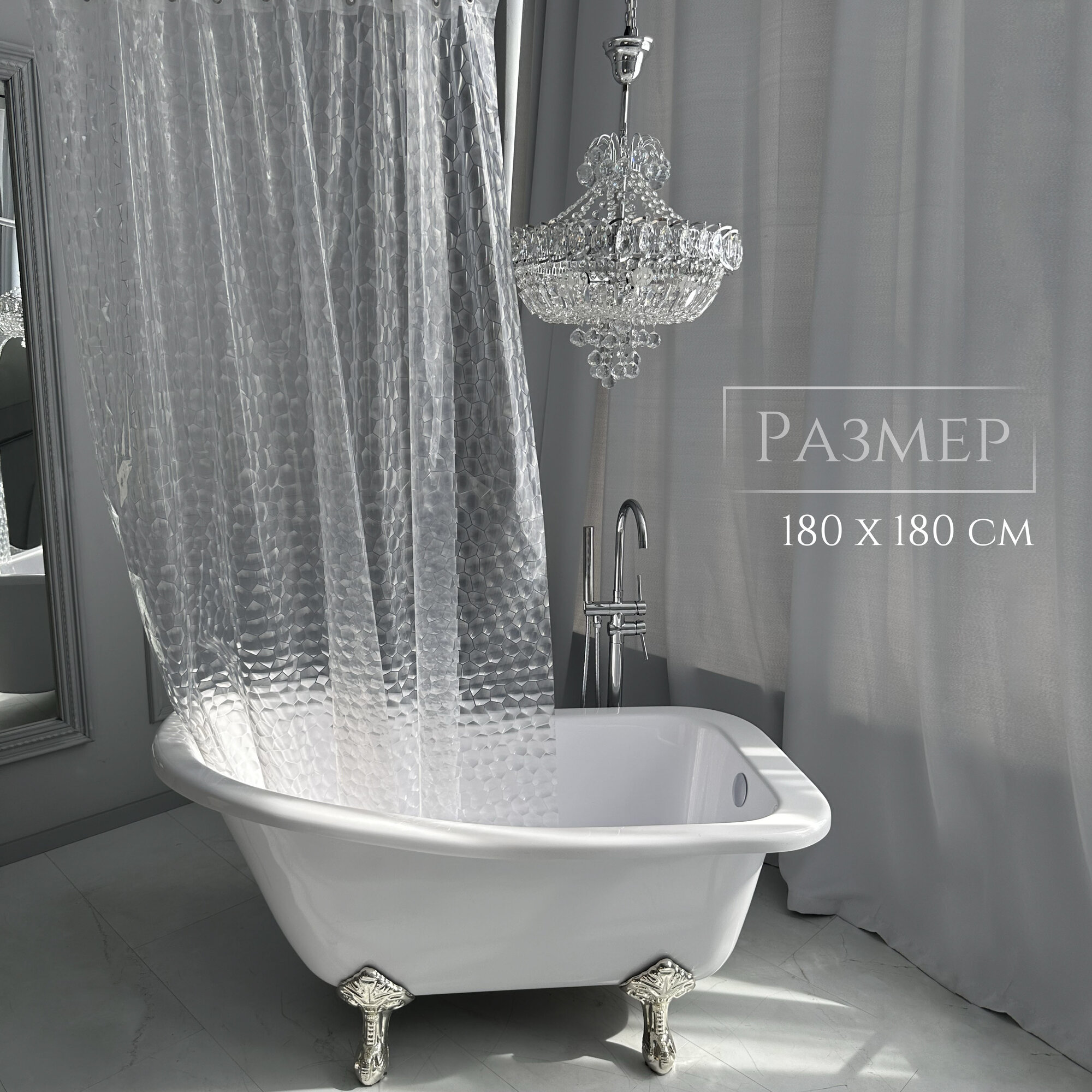 Штора для ванной, занавеска душевая водонепроницаемая, матовая, прозрачная 180х180 с кольцами