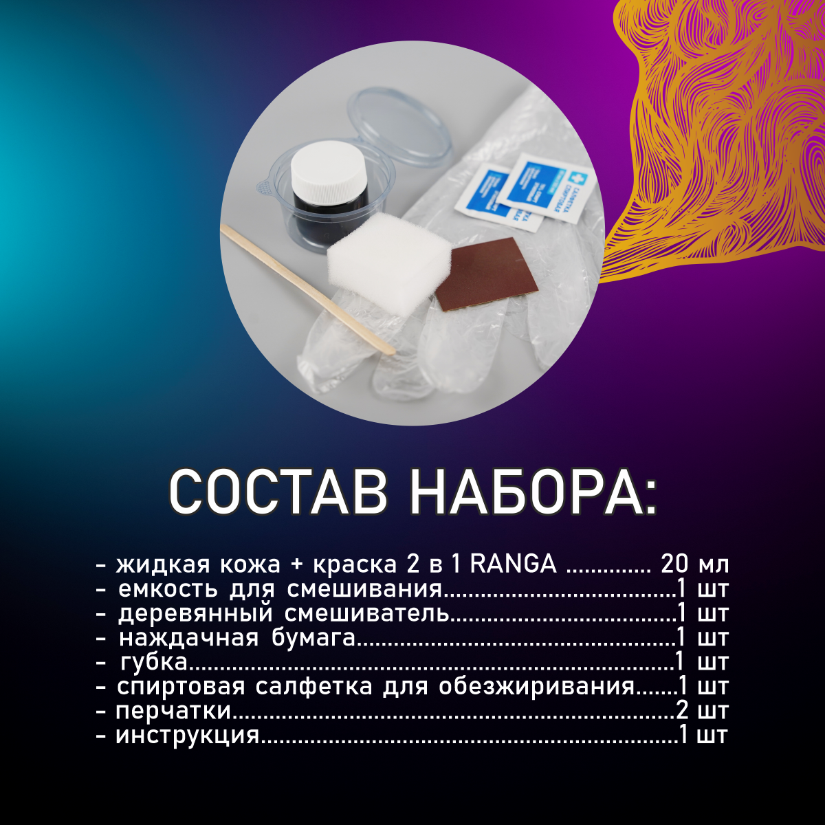 | Состав набора | губка / жидкая кожа / салфетка |